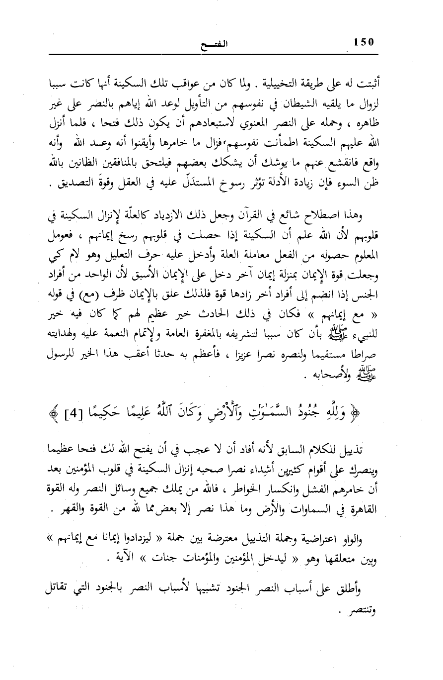 أُثْبِتَتْ لَهُ عَلَى طَرِيقَةِ التَّخْيِيلِيَّةِ. وَلَمَّا كَانَ مِنْ عَوَاقِبِ تِلْكَ السَّكِينَةِ أَنَّهَا كَانَتْ سَبَبًا لِزَوَالِ مَا يُلْقِيهِ الشَّيْطَانُ فِي نُفُوسِهِمْ مِنَ التَّأْوِيلِ لِوَعْدِ اللَّهِ إِيَّاهُمْ بِالنَّصْرِ عَلَى غَيْرِ ظَاهِرِهِ، وَحَمْلِهِ عَلَى النَّصْرِ الْمَعْنَوِيِّ لِاسْتِبْعَادِهِمْ أَنْ يَكُونَ ذَلِكَ فَتْحًا، فَلَمَّا أَنْزَلَ اللَّهُ عَلَيْهِمُ السَّكِينَةَ اطْمَأَنَّتْ نُفُوسُهُمْ، فَزَالَ مَا خَامَرَهَا وَأَيْقَنُوا أَنَّهُ وَعْدُ اللَّهِ وَأَنَّهُ وَاقِعٌ فَانْقَشَعَ عَنْهُمْ مَا يُوشِكُ أَنْ يُشَكِّكَ بَعْضَهُمْ فَيَلْتَحِقَ بِالْمُنَافِقِينَ الظَّانِّينَ بِاللَّهِ ظَنَّ السَّوْءِ فَإِنَّ زِيَادَةَ الْأَدِلَّةِ تُؤَثِّرُ رُسُوخَ الْمُسْتَدَلِّ عَلَيْهِ فِي الْعَقْلِ وَقُوَّةَ التَّصْدِيقِ. وَهَذَا اصْطِلَاحٌ شَائِعٌ فِي الْقُرْآنِ وَجُعِلَ ذَلِكَ الِازْدِيَادُ كَالْعِلَّةِ لِإِنْزَالِ السَّكِينَةِ فِي قُلُوبِهِمْ لِأَنَّ اللَّهَ عَلِمَ أَن السكينَة إِذْ حَصَلَتْ فِي قُلُوبِهِمْ رَسَخَ إِيمَانُهُمْ، فَعُومِلَ الْمَعْلُومُ حُصُولُهُ مِنَ الْفِعْلِ مُعَامَلَةَ الْعِلَّةِ وَأُدْخِلَ عَلَيْهِ حَرْفُ التَّعْلِيلِ وَهُوَ لَامُ- كَيْ- وَجُعِلَتْ قُوَّةُ الْإِيمَانِ بِمَنْزِلَةِ إِيمَانٍ آخَرَ دَخَلَ عَلَى الْإِيمَانِ الْأَسْبَقِ لِأَنَّ الْوَاحِدَ مِنْ أَفْرَادِ الْجِنْسِ إِذَا انْضَمَّ