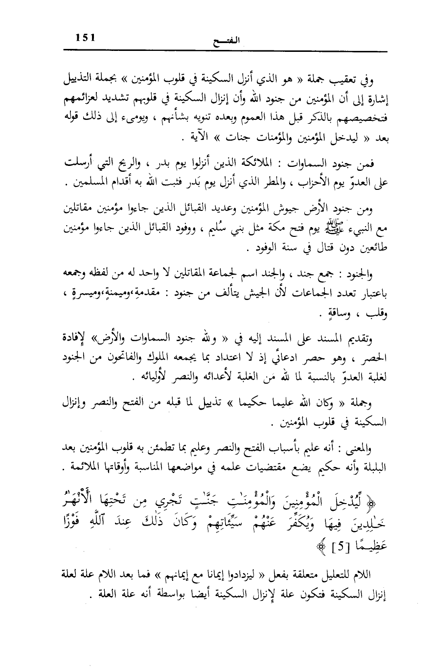 وَتَقْدِيمُ الْمُسْنَدِ عَلَى الْمُسْنَدِ إِلَيْهِ فِي وَلِلَّهِ جُنُودُ السَّماواتِ وَالْأَرْضِ لِإِفَادَةِ الْحَصْرِ، وَهُوَ حَصْرٌ ادِّعَائِيٌّ إِذْ لَا اعْتِدَادَ بِمَا يَجْمَعُهُ الْمُلُوكُ وَالْفَاتِحُونَ مِنَ الْجُنُودِ لِغَلَبَةِ الْعَدُوِّ بِالنِّسْبَةِ لِمَا لِلَّهِ مِنَ الْغَلَبَةِ لِأَعْدَائِهِ وَالنَّصْرِ لِأَوْلِيَائِهِ. وَجُمْلَةُ وَكانَ اللَّهُ عَلِيماً حَكِيماً تَذْيِيلٌ لِمَا قَبْلَهُ مِنَ الْفَتْحِ وَالنَّصْرِ وَإِنْزَالِ السَّكِينَةِ فِي قُلُوبِ الْمُؤْمِنِينَ.