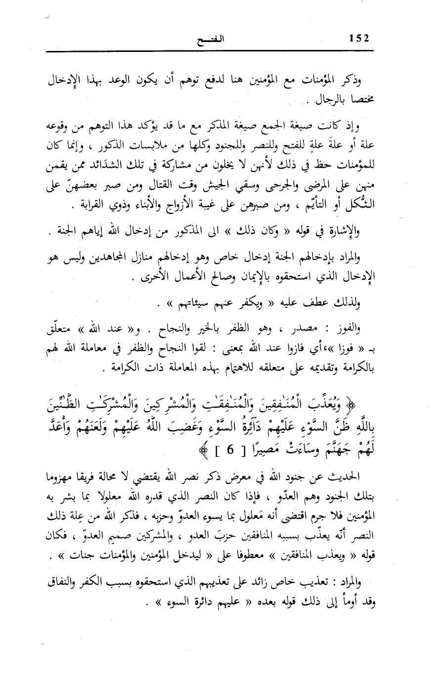 وَذِكْرُ الْمُؤْمِنَاتِ مَعَ الْمُؤْمِنِينَ هُنَا لِدَفْعِ تَوَهُّمِ أَنْ يَكُونَ الْوَعْدُ بِهَذَا الْإِدْخَالِ مُخْتَصًّا بِالرِّجَالِ. وَإِذْ كَانَتْ صِيغَةُ الْجَمْعِ صِيغَةَ الْمُذَكَّرِ مَعَ مَا قَدْ يُؤَكِّدُ هَذَا التَّوَهُّمَ مِنْ وُقُوعِهِ عِلَّةً أَوْ عِلَّةَ عِلَّةٍ لِلْفَتْحِ وَلِلنَّصْرِ وَلِلْجُنُودِ وَكُلِّهَا مِنْ مُلَابَسَاتِ الذُّكُورِ، وَإِنَّمَا كَانَ لِلْمُؤْمِنَاتِ حَظٌّ فِي ذَلِكَ لِأَنَّهُنَّ لَا يَخْلُونَ مِنْ مُشَارَكَةٍ فِي تِلْكَ الشَّدَائِدِ مِمَّنْ يُقِمْنَ مِنْهُنَّ عَلَى الْمَرْضَى وَالْجَرْحَى وَسَقْيِ الْجَيْشِ وَقْتَ الْقِتَالِ وَمِنْ صَبْرِ بِعْضِهِنَّ عَلَى الثُّكْلِ أَوِ التَّأَيُّمِ، وَمِنْ صَبْرِهِنَّ عَلَى غَيْبَةِ الْأَزْوَاجِ وَالْأَبْنَاءِ وَذَوِي الْقَرَابَةِ. وَالْإِشَارَةُ فِي قَوْلِهِ وَكانَ ذلِكَ إِلَى الْمَذْكُورِ مِنْ إِدْخَالِ اللَّهِ إِيَّاهُمُ الْجَنَّةَ.