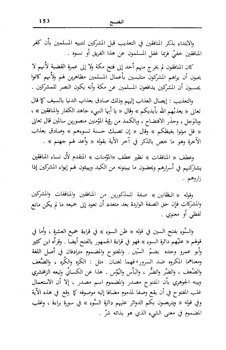 وَالسَّوْءُ بِفَتْحِ السِّينِ فِي قَوْلِهِ: ظَنَّ السَّوْءِ فِي قِرَاءَةِ جَمِيعِ الْعَشَرَةِ، وَأَمَّا فِي قَوْلِهِمْ عَلَيْهِمْ دائِرَةُ السَّوْءِ فَهُوَ فِي قِرَاءَةِ الْجُمْهُورِ بِالْفَتْحِ أَيْضًا. وَقَرَأَهُ ابْنُ كَثِيرٍ وَأَبُو عَمْرٍو وَحْدَهُ بِضَمِّ السِّينِ. وَالْمَفْتُوحُ وَالْمَضْمُومُ مُتَرَادِفَانِ فِي أَصْلِ اللُّغَةِ وَمَعْنَاهُمَا الْمَكْرُوهُ ضِدُّ السُّرُورِ، فَهُمَا لُغَتَانِ مِثْلُ: الْكَرْهُ وَالْكُرْهُ، الضّعف وَالضُّعْفُ، وَالضَّرُّ وَالضُّرُّ، وَالْبَأْسُ وَالْبُؤْسُ. هَذَا عَنِ الْكِسَائِيِّ وَتَبِعَهُ الزَّمَخْشَرِيُّ وَبَيَّنَهُ الْجَوْهَرِيُّ بِأَنَّ الْمَفْتُوحَ مَصْدَرٌ وَالْمَضْمُومَ اسْمُ مَصْدَرٍ، إِلَّا أَنَّ الِاسْتِعْمَالَ غَلَبَ الْمَفْتُوحُ فِي أَنْ يَقَعَ وَصْفًا لِمَذْمُومٍ مُضَافًا إِلَيْهِ مَوْصُوفُهُ كَمَا وَقَعَ فِي هَذِهِ الْآيَةِ وَفِي قَوْله: وَيَتَرَبَّصُ بِكُمُ الدَّوائِرَ عَلَيْهِمْ دائِرَةُ السَّوْءِ فِي سُورَةِ بَرَاءَةٌ [98] ، وَغَلَبَ الْمَضْمُومُ فِي مَعْنَى الشَّيْءِ الَّذِي هُوَ بِذَاتِهِ شَرٌّ.