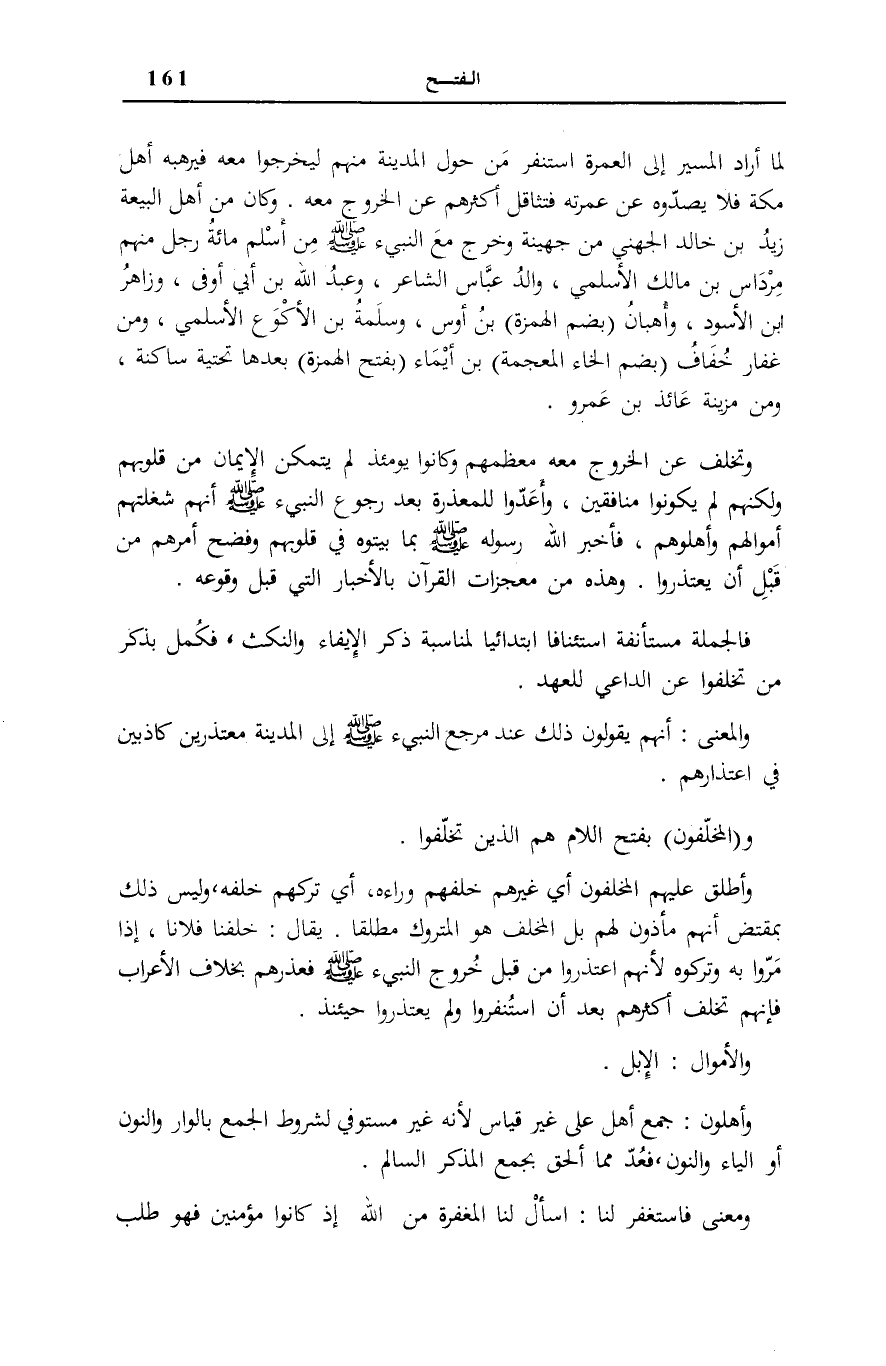 لَمَّا أَرَادَ الْمَسِيرَ إِلَى الْعُمْرَةِ اسْتَنْفَرَ مِنْ حَوْلِ الْمَدِينَةِ مِنْهُمْ لِيَخْرُجُوا مَعَهُ فَيَرْهَبَهُ أَهْلُ مَكَّةَ فَلَا يَصُدُّوهُ عَنْ عُمْرَتِهِ فَتَثَاقَلَ أَكْثَرُهُمْ عَنِ الْخُرُوجِ مَعَهُ.