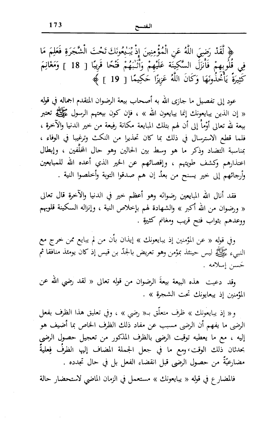 وَقَدْ دُعِيَتْ هَذِهِ الْبَيْعَةُ بَيْعَةَ الرِّضْوَانِ مِنْ قَوْلِهِ تَعَالَى: لَقَدْ رَضِيَ اللَّهُ عَنِ الْمُؤْمِنِينَ إِذْ يُبايِعُونَكَ تَحْتَ الشَّجَرَةِ. وإِذْ يُبايِعُونَكَ ظَرْفٌ مُتَعَلِّقٌ بِ رَضِيَ، وَفِي تَعْلِيقِ هَذَا الظّرْف بِفعل الرضى مَا يفهم أَن الرضى مُسَبَّبٌ عَنْ مَفَادِ ذَلِكَ الظَّرْفِ الْخَاصِّ بِمَا أُضِيفَ هُوَ إِلَيْهِ، مَعَ مَا يُعْطِيهِ تَوْقِيت الرضى بِالظَّرْفِ الْمَذْكُورِ مِنْ تَعْجِيل حُصُول الرضى بِحِدْثَانِ ذَلِكَ الْوَقْتِ، وَمَعَ مَا فِي جَعْلِ الْجُمْلَةِ الْمُضَافِ إِلَيْهَا الظَّرْفُ فِعْلِيَّةً مُضَارِعِيَّةً من حُصُول الرضى قَبْلَ انْقِضَاءِ الْفِعْلِ بَلْ فِي حَالِ تَجَدُّدِهِ. فَالْمُضَارِعُ فِي قَوْلِهِ يُبايِعُونَكَ مُسْتَعْمِلٌ فِي الزَّمَانِ الْمَاضِي لِاسْتِحْضَارِ حَالَةِ