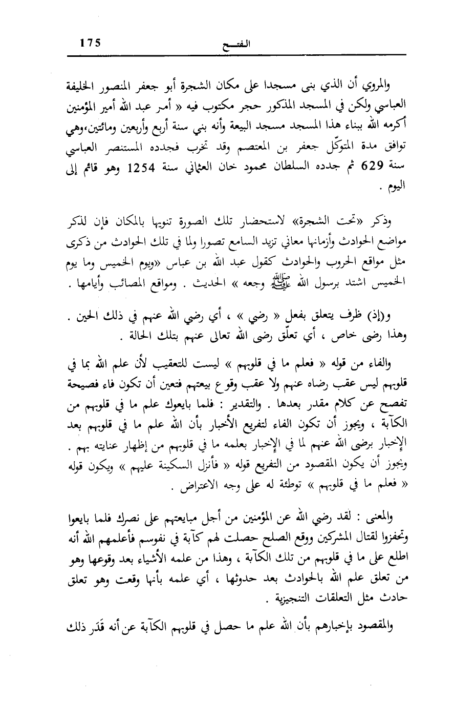 وَالْفَاء فِي قَوْلِهِ: فَعَلِمَ مَا فِي قُلُوبِهِمْ لَيْسَتْ لِلتَّعْقِيبِ لِأَنَّ عِلْمَ اللَّهِ بِمَا فِي قُلُوبِهِمْ لَيْسَ عَقِبَ رِضَاهُ عَنْهُمْ وَلَا عَقِبَ وُقُوعِ بَيْعَتِهِمْ فَتَعَيَّنَ أَنْ تَكُونَ فَاءً فَصِيحَةً تُفْصِحُ عَنْ كَلَامٍ مُقَدَّرٍ بَعْدَهَا. وَالتَّقْدِيرُ: فَلَمَّا بَايَعُوكَ عَلِمَ مَا فِي قُلُوبِهِمْ مِنَ الْكَآبَةِ، وَيَجُوزُ أَنْ تَكُونَ الْفَاءُ لِتَفْرِيعِ الْأَخْبَارِ بِأَنَّ اللَّهَ عَلِمَ مَا فِي قُلُوبِهِمْ بعد الْإِخْبَار برضى اللَّهُ عَنْهُمْ لِمَا فِي الْإِخْبَارِ بِعِلْمِهِ مَا فِي قُلُوبِهِمْ مِنْ إِظْهَارِ عِنَايَتِهِ بِهِمْ. وَيَجُوزُ أَنْ يَكُونَ الْمَقْصُودُ مِنَ التَّفْرِيعِ قَوْلُهُ: