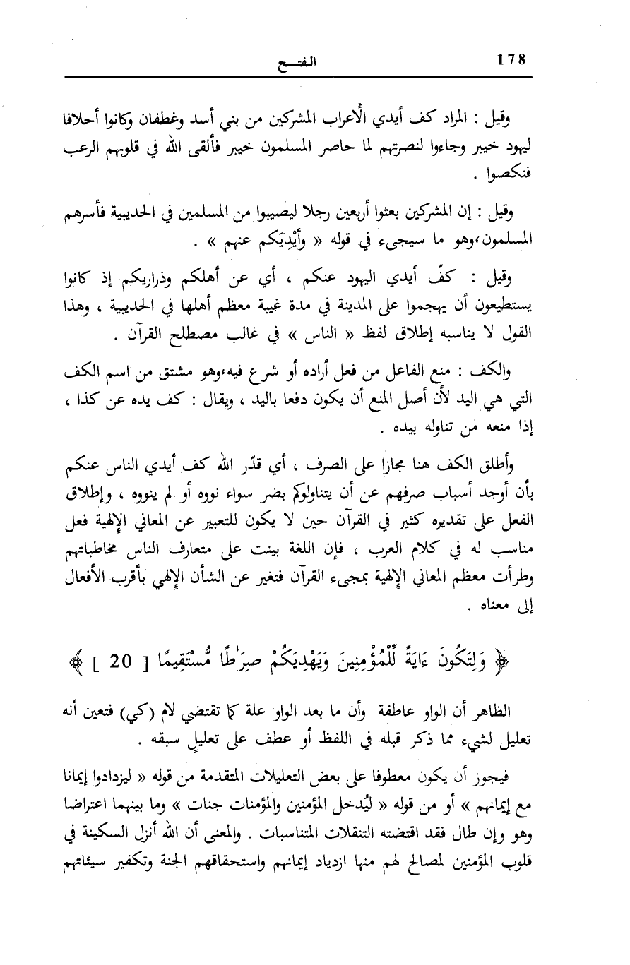 وَقِيلَ: إِنَّ الْمُشْرِكِينَ بَعَثُوا أَرْبَعِينَ رَجُلًا لِيُصِيبُوا مِنَ الْمُسْلِمِينَ فِي الْحُدَيْبِيَةِ فَأَسَرَهُمُ الْمُسْلِمُونَ، وَهُوَ مَا سَيَجِيءُ فِي قَوْلِهِ: وَأَيْدِيَكُمْ عَنْهُمْ [الْفَتْح: 24] . وَقِيلَ: كَفَّ أَيْدِيَ الْيَهُودِ عَنْكُمْ، أَيْ عَن أهلكم وذاريكم إِذْ كَانُوا يَسْتَطِيعُونَ أَنْ يَهْجُمُوا عَلَى الْمَدِينَةِ فِي مُدَّةِ غَيْبَةِ مُعْظَمِ أَهْلِهَا فِي الْحُدَيْبِيَةِ، وَهَذَا الْقَوْلُ لَا يُنَاسِبُهُ إِطْلَاقُ لَفْظِ النَّاسِ فِي غَالِبِ مُصْطَلَحِ الْقُرْآنِ.