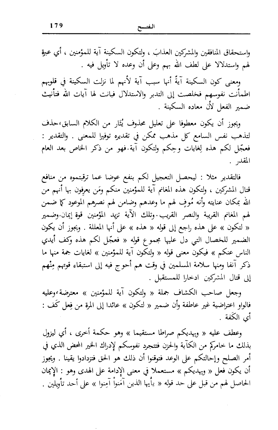 وَمعنى كَوْنُ السَّكِينَةِ آيَةً أَنَّهَا سَبَبُ آيَةٍ لِأَنَّهُمْ لَمَّا نَزَلَتِ السَّكِينَةُ فِي قُلُوبِهِمُ اطْمَأَنَّتْ نُفُوسُهُمْ فَخَلُصَتْ إِلَى التَّدَبُّرِ وَالِاسْتِدْلَالِ فَبَانَتْ لَهَا آيَاتُ اللَّهِ فَتَأْنِيثُ ضَمِيرِ الْفِعْلِ لِأَنَّ مَعَادَهُ السَّكِينَةُ. وَيَجُوزُ أَنْ يَكُونَ مَعْطُوفًا عَلَى تَعْلِيلٍ مَحْذُوفٍ يُثَارُ مِنَ الْكَلَامِ السَّابِقِ، حُذِفَ لِتَذْهَبَ نَفْسُ السَّامِعِ كُلَّ مَذْهَبٍ مُمْكِنٍ فِي تَقْدِيرِهِ تَوْفِيرًا لِلْمَعْنَى. وَالتَّقْدِيرُ: فَعَجَّلَ لَكُمْ هَذِهِ لِغَايَاتٍ وَحِكَمٍ وَلِتَكُونَ آيَةً. فَهُوَ مِنْ ذِكْرِ الْخَاصِّ بَعْدَ الْعَامِّ الْمُقَدَّرِ.