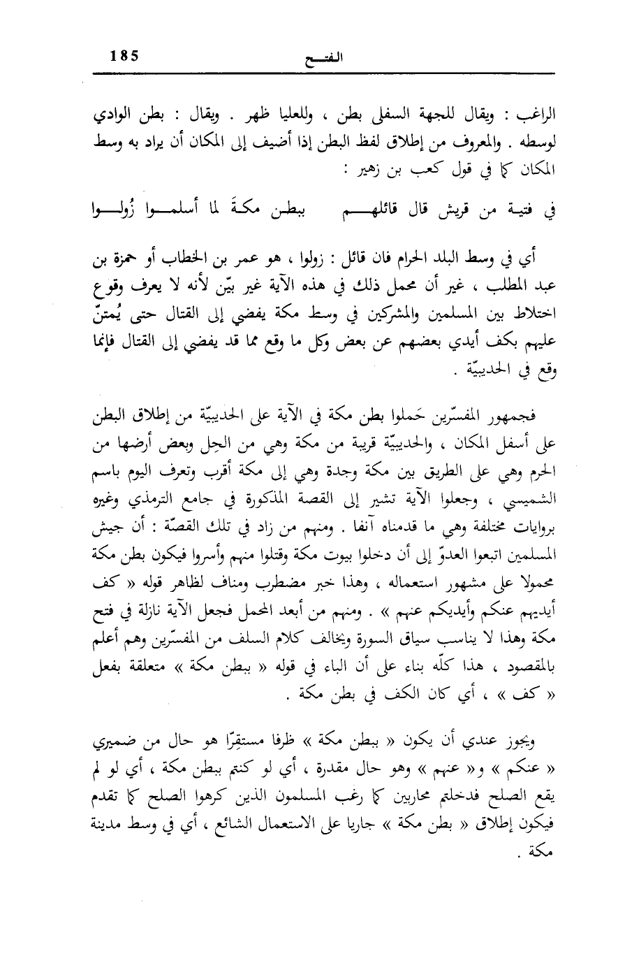 أَيْ فِي وَسَطِ الْبَلَدِ الْحَرَامِ فَإِنَّ قَائِلَ: زُولُوا، هُوَ عُمَرُ بْنُ الْخَطَّابِ أَوْ حَمْزَةُ بْنُ عَبْدِ الْمَطَّلِبِ، غَيْرَ أَنَّ مَحْمَلَ ذَلِكَ فِي هَذِهِ الْآيَةِ غَيْرُ بَيِّنٍ لِأَنَّهُ لَا يُعْرَفُ وُقُوعُ اخْتِلَاطٍ بَيْنَ الْمُسْلِمِينَ وَالْمُشْرِكِينَ فِي وَسَطِ مَكَّةَ يُفْضِي إِلَى الْقِتَالِ حَتَّى يُمْتَنَّ عَلَيْهِمْ بِكَفِّ أَيْدِي بَعْضِهِمْ عَنْ بَعْضٍ وَكُلُّ مَا وَقع مِمَّا قد يُفْضِي إِلَى الْقِتَالِ فَإِنَّمَا وَقَعَ فِي الْحُدَيْبِيَةِ. فَجُمْهُورُ الْمُفَسِّرِينَ حَمَلُوا بَطْنَ مَكَّةَ فِي الْآيَةِ عَلَى الْحُدَيْبِيَةِ مِنْ إِطْلَاقِ الْبَطْنِ عَلَى أَسْفَلِ الْمَكَانِ، وَالْحُدَيْبِيَةُ قَرِيبَةٌ مَنْ مَكَّةَ وَهِيَ مِن الْحِلِّ وَبَعْضُ أَرْضِهَا مِنَ الْحَرَمِ وَهِيَ عَلَى الطَّرِيقِ بَيْنَ مَكَّةَ وَجُدَّةَ وَهِيَ إِلَى مَكَّةَ أَقْرَبُ وَتُعْرَفُ الْيَوْمَ بَاسِمِ الشَّمِيسِي، وَجَعَلُوا الْآيَةَ تُشِيرُ إِلَى الْقِصَّةِ الْمَذْكُورَةِ فِي «جَامِعِ التِّرْمِذِيِّ» وَغَيْرِهِ بِرِوَايَاتٍ مُخْتَلِفَةٍ وَهِيَ مَا قَدَّمْنَاهُ آنِفًا. وَمِنْهُمْ مَنْ زَادَ فِي تِلْكَ الْقِصَّةِ: أَنَّ جَيْشَ الْمُسْلِمِينَ اتَّبَعُوا الْعَدُوَّ إِلَى أَنْ دَخَلُوا بُيُوتَ مَكَّةَ وَقَتَلُوا مِنْهُمْ وَأَسَرُوا فَيَكُونُ بَطْنُ مَكَّةَ مَحْمُولًا عَلَى مَشْهُورِ اسْتِعْمَالِهِ، وَهَذَا خَبَرٌ مُضْطَرِبٌ وَمُنَافٍ لِظَاهِرِ قَوْلِهِ: