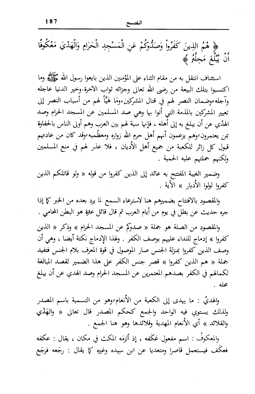 وَالْمَقْصُودُ مِنَ الصِّلَةِ هُوَ جُمْلَةُ صَدُّوكُمْ عَنِ الْمَسْجِدِ الْحَرامِ وَذِكْرُ الَّذِينَ كَفَرُوا إِدْمَاجٌ لِلنِّدَاءِ عَلَيْهِمْ بِوَصْفِ الْكُفْرِ وَلِهَذَا الْإِدْمَاجِ نُكْتَةٌ أَيْضًا، وَهِيَ أَنَّ وَصْفَ الَّذِينَ كَفَرُوا بِمَنْزِلَةِ الْجِنْسِ صَارَ الْمَوْصُولُ فِي قُوَّةِ الْمُعَرَّفِ بِلَامِ الْجِنْسِ فَتُفِيدُ جُمْلَةُ هُمُ الَّذِينَ كَفَرُوا قَصْرَ جِنْسِ الْكُفْرِ عَلَى هَذَا الضَّمِيرِ لِقَصْدِ الْمُبَالَغَةِ لِكَمَالِهِمْ فِي الْكُفْرِ بِصَدِّهِمُ الْمُعْتَمِرِينَ عَنِ الْمَسْجِدِ الْحَرَامِ وَصَدِّ الْهَدْيِ عَنْ أَنْ يَبْلُغَ مَحِلَّهُ.