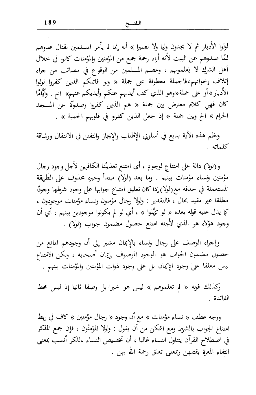لَوَلَّوُا الْأَدْبارَ ثُمَّ لَا يَجِدُونَ وَلِيًّا وَلا نَصِيراً [الْفَتْح: 22] أَنَّهُ إِنَّمَا لَمْ يَأْمُرِ الْمُسْلِمِينَ بِقِتَالِ عَدُوِّهِمْ لَمَّا صَدُّوهُمْ عَنِ الْبَيْتِ لِأَنَّهُ أَرَادَ رَحْمَةَ جَمْعٍ مِنَ الْمُؤْمِنِينَ وَالْمُؤْمِنَاتِ كَانُوا فِي خِلَالِ أَهْلِ الشِّرْكِ لَا يَعْلَمُونَهُمْ، وَعَصَمَ الْمُسْلِمِينَ مِنَ الْوُقُوعِ فِي مَصَائِبَ مِنْ جَرَّاءِ إِتْلَافِ إِخْوَانِهِمْ، فَالْجُمْلَةُ مَعْطُوفَةٌ عَلَى جُمْلَةِ وَلَوْ قاتَلَكُمُ الَّذِينَ كَفَرُوا لَوَلَّوُا الْأَدْبارَ أَوْ عَلَى جُمْلَةِ وَهُوَ الَّذِي كَفَّ أَيْدِيَهُمْ عَنْكُمْ وَأَيْدِيَكُمْ عَنْهُمْ [الْفَتْح: 24] إِلَخْ. وَأَيًّا مَا كَانَ فَهِيَ كَلَامٌ مُعْتَرِضٌ بَيْنَ جُمْلَةِ هُمُ الَّذِينَ كَفَرُوا وَصَدُّوكُمْ عَنِ الْمَسْجِدِ الْحَرامِ إِلَخْ وَبَيْنَ جُمْلَةِ إِذْ جَعَلَ الَّذِينَ كَفَرُوا فِي قُلُوبِهِمُ الْحَمِيَّةَ [الْفَتْح: 26] . وَنَظْمُ هَذِهِ الْآيَةِ بَدِيعٌ فِي أُسْلُوبَيِ الْإِطْنَابِ وَالْإِيجَازِ وَالتَّفَنُّنِ فِي الِانْتِقَالِ وَرَشَاقَةِ كَلِمَاتِهِ.