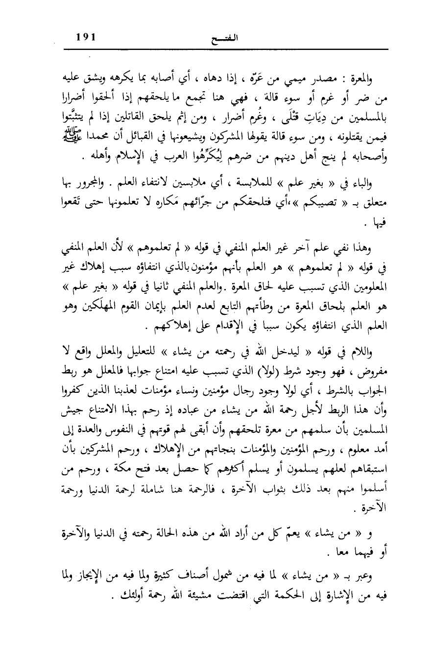 وَاللَّامُ فِي قَوْلِهِ: لِيُدْخِلَ اللَّهُ فِي رَحْمَتِهِ مَنْ يَشاءُ لِلتَّعْلِيلِ وَالْمُعَلَّلُ وَاقِعٌ لَا مَفْرُوضٌ، فَهُوَ وُجُودُ شَرْطِ لَوْلا الَّذِي تَسَبَّبَ عَلَيْهِ امْتِنَاعُ جَوَابِهَا فَالْمُعَلَّلُ هُوَ رَبْطُ الْجَوَابِ بِالشَّرْطِ، أَيْ لَوْلَا وُجُودُ رِجَالٍ مُؤْمِنِينَ وَنِسَاءٍ مُؤْمِنَاتٍ لَعَذَّبْنَا الَّذِينَ كَفَرُوا وَأَنَّ هَذَا الرَّبْطَ لِأَجْلِ رَحْمَةِ اللَّهِ مَنْ يَشَاءُ مِنْ عِبَادِهِ إِذْ رَحِمَ بِهَذَا الِامْتِنَاعِ جَيْشَ الْمُسْلِمِينَ بِأَنْ سَلَّمَهُمْ مِنْ مَعَرَّةٍ تَلْحَقُهُمْ وَأَنْ أَبْقَى لَهُمْ قُوَّتَهُمْ فِي النُّفُوسِ وَالْعُدَّةِ إِلَى أَمَدٍ مَعْلُومٍ، وَرَحِمَ الْمُؤْمِنِينَ وَالْمُؤْمِنَاتِ بِنَجَاتِهِمْ مِنَ الْإِهْلَاكِ، وَرَحِمَ الْمُشْرِكِينَ بِأَنِ اسْتَبَقَاهُمْ لَعَلَّهُمْ يُسْلِمُونَ أَوْ يُسْلِمُ أَكْثَرُهُمْ كَمَا حَصَلَ بَعْدَ فَتْحِ مَكَّةَ، وَرَحِمَ مَنْ أَسْلَمُوا مِنْهُمْ بَعْدَ ذَلِكَ بِثَوَابِ الْآخِرَةِ، فَالرَّحْمَةُ هُنَا شَامِلَةٌ لِرَحْمَةِ الدُّنْيَا وَرَحْمَةِ الْآخِرَةِ.