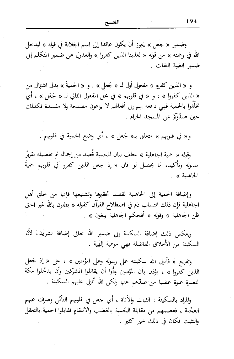 والَّذِينَ كَفَرُوا مَفْعُولٌ أَوَّلُ لِ جَعَلَ. والْحَمِيَّةَ بَدَلُ اشْتِمَالٍ مِنْ الَّذِينَ كَفَرُوا، وفِي قُلُوبِهِمُ فِي مَحَلِّ الْمَفْعُولِ الثَّانِي لِ جَعَلَ، أَيْ تَخَلَّقُوا بِالْحَمِيَّةِ فَهِيَ دَافِعَةٌ بِهِمْ إِلَى أَفْعَالِهِمْ لَا يُرَاعُونَ مَصْلَحَةً وَلَا مَفْسَدَةً فَكَذَلِكَ حِينَ صَدُّوكُمْ عَنِ الْمَسْجِدِ الْحَرَامِ.