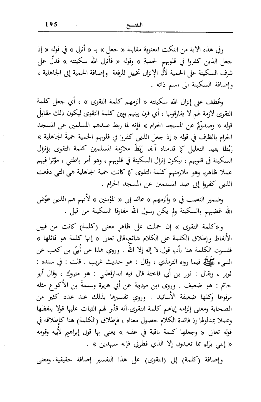 ، وَقَالَ: هُوَ حَدِيثٌ غَرِيبٌ. قُلْتُ: فِي سَنَدِهِ: ثُوَيْرٌ، وَيُقَالُ: ثَوْرُ بْنُ أَبِي فَاخِتَةَ قَالَ فِيهِ الدَّارَقُطْنِيُّ: هُوَ مَتْرُوكٌ، وَقَالَ أَبُو حَاتِمٍ: هُوَ ضَعِيفٌ. وَرَوَى ابْنُ مَرْدَوَيْهِ عَنْ أَبِي هُرَيْرَةَ وَسَلَمَةَ بْنِ الْأَكْوَعِ مِثْلَهُ مَرْفُوعًا وَكُلُّهَا ضَعِيفَةُ الْأَسَانِيدِ. وَرُوِيَ تَفْسِيرُهَا بِذَلِكَ عِنْدَ عَدَدٍ كَثِيرٍ مِنَ الصَّحَابَةِ وَمَعْنَى إِلْزَامِهِ إِيَّاهُمْ كَلِمَةَ التَّقْوَى: أَنَّهُ قَدَّرَ لَهُمُ الثَّبَاتَ عَلَيْهَا قَوْلًا بِلَفْظِهَا وَعَمَلًا بِمَدْلُولِهَا إِذْ فَائِدَةُ الْكَلَامِ حُصُولُ مَعْنَاهُ، فَإِطْلَاقُ (الْكَلِمَةِ) هُنَا كَإِطْلَاقِهِ فِي قَوْلِهِ تَعَالَى: وَجَعَلَها كَلِمَةً باقِيَةً فِي عَقِبِهِ [الزخرف: 28] يَعْنِي بِهَا قَوْلَ إِبْرَاهِيمَ لِأَبِيهِ وَقَوْمِهِ إِنَّنِي بَراءٌ مِمَّا تَعْبُدُونَ إِلَّا الَّذِي فَطَرَنِي فَإِنَّهُ سَيَهْدِينِ [الزخرف: 26، 27] .