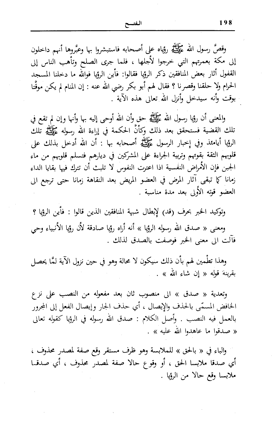 وَمَعْنَى صَدَقَ اللَّهُ رَسُولَهُ الرُّؤْيا أَنَّهُ أَرَاهُ رُؤْيَا صَادِقَةً لِأَنَّ رُؤْيَا الْأَنْبِيَاءِ وَحْيٌ فَآلَتْ إِلَى مَعْنَى الْخَبَرِ فَوُصِفَتْ بِالصِّدْقِ لِذَلِكَ. وَهَذَا تَطْمِينٌ لَهُمْ بِأَنَّ ذَلِكَ سَيَكُونُ لَا مَحَالَةَ وَهُوَ فِي حِينِ نُزُولِ الْآيَةِ لَمَّا يَحْصُلْ بِقَرِينَةِ قَوْلِهِ: إِنْ شاءَ اللَّهُ.