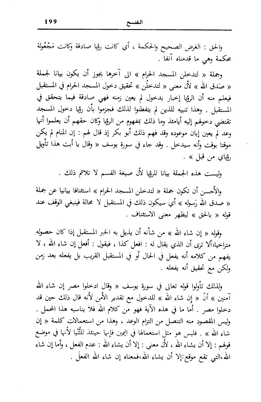اللَّهُ لِأَنَّ مَعْنَى لَتَدْخُلُنَّ تَحْقِيقُ دُخُولِ الْمَسْجِدِ الْحَرَامِ فِي الْمُسْتَقْبَلِ فَيُعْلَمُ مِنْهُ أَنَّ الرُّؤْيَا إِخْبَارٌ بِدُخُولٍ لَمْ يُعَيَّنْ زَمَنُهُ فَهِيَ صَادِقَةٌ فِيمَا يَتَحَقَّقُ فِي الْمُسْتَقْبَلِ. وَهَذَا تَنْبِيهٌ لِلَّذِينَ لَمْ يَتَفَطَّنُوا لِذَلِكَ فَجَزَمُوا بِأَنَّ رُؤْيَا دُخُولِ الْمَسْجِدِ تَقْتَضِي دُخُولَهُمْ إِلَيْهِ أَيَّامَئِذٍ وَمَا ذَلِكَ بِمَفْهُومٍ مِنَ الرُّؤْيَا وَكَانَ حَقَّهُمْ أَنْ يَعْلَمُوا أَنَّهَا وَعْدٌ لَمْ يُعَيَّنْ إِبَّانَ مَوْعُودِهِ وَقَدْ فَهِمَ ذَلِكَ أَبُو بَكْرٍ إِذْ قَالَ لَهُمْ: إِنَّ الْمَنَامَ لَمْ يَكُنْ مُوَقَّتًا بِوَقْتٍ وَأَنَّهُ سَيَدْخُلُ. وَقَدْ جَاءَ فِي سُورَةِ يُوسُفَ [100] وَقالَ يَا أَبَتِ هَذَا تَأْوِيلُ رُءْيايَ مِنْ قَبْلُ. وَلَيْسَتْ هَذِهِ الْجُمْلَةُ بَيَانًا لِلرُّؤْيَا لِأَنَّ صِيغَةَ الْقَسَمِ لَا تُلَائِمُ ذَلِكَ.