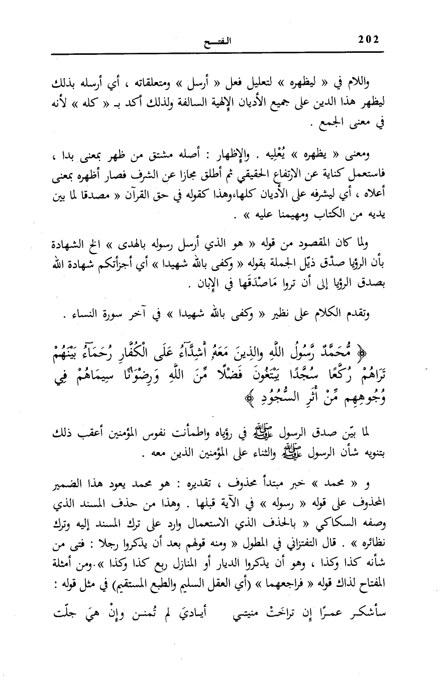 مُحَمَّدٌ رَسُولُ اللَّهِ وَالَّذِينَ مَعَهُ أَشِدَّاءُ عَلَى الْكُفَّارِ رُحَماءُ بَيْنَهُمْ تَراهُمْ رُكَّعاً سُجَّداً يَبْتَغُونَ فَضْلًا مِنَ اللَّهِ وَرِضْواناً سِيماهُمْ فِي وُجُوهِهِمْ مِنْ أَثَرِ السُّجُودِ لَمَّا بَيَّنَ صدق الرَّسُول صَلَّى اللهُ عَلَيْهِ وَسَلَّمَ فِي رُؤْيَاهُ وَاطْمَأَنَّتْ نُفُوسُ الْمُؤْمِنِينَ أَعْقَبَ ذَلِكَ بِتَنْوِيهِ شَأْن الرَّسُول صَلَّى اللهُ عَلَيْهِ وَسَلَّمَ وَالثَّنَاءِ عَلَى الْمُؤْمِنِينَ الَّذِينَ مَعَهُ.