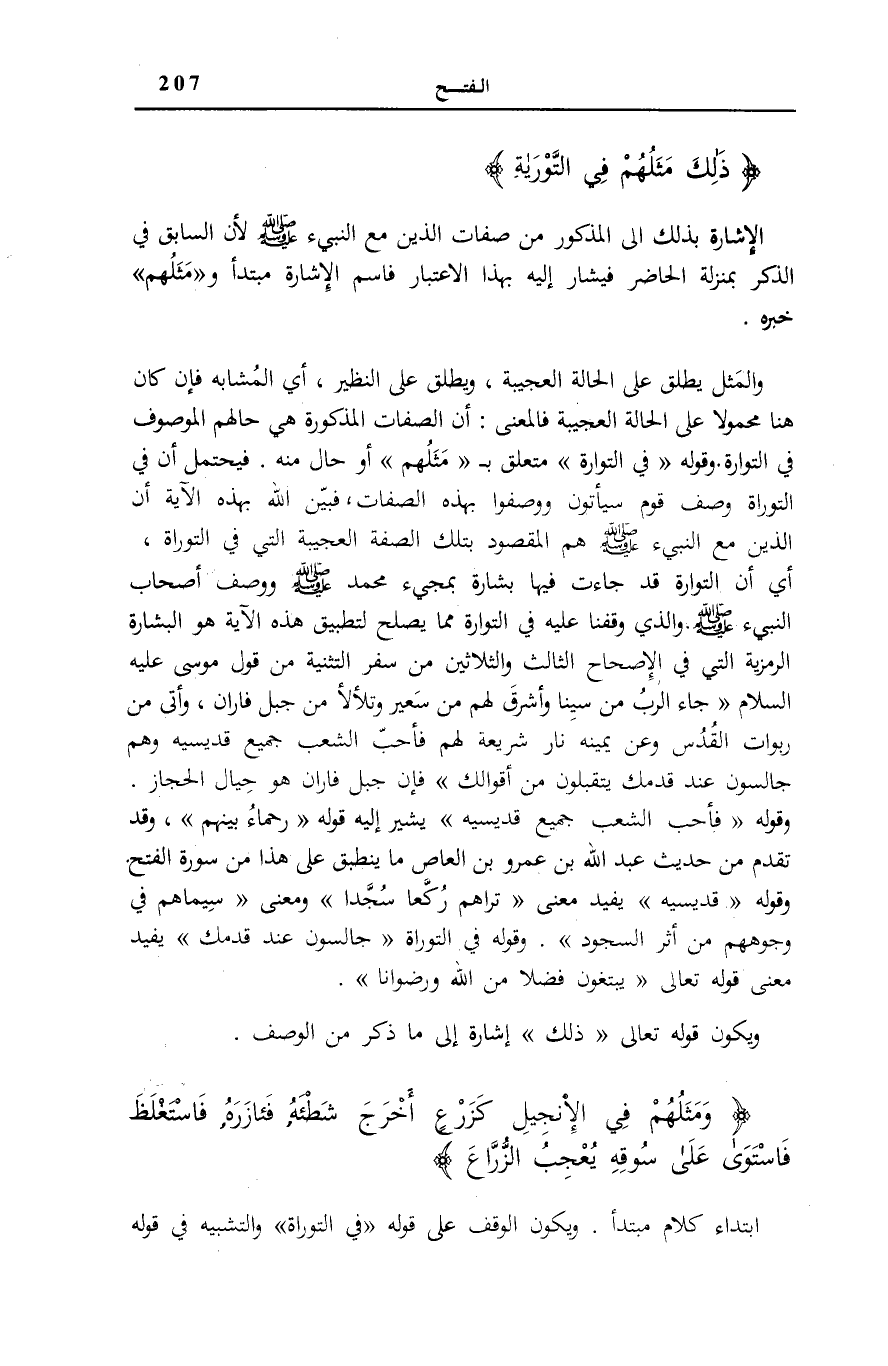 «فَأَحَبَّ الشَّعْبُ جَمِيعَ قِدِّيسِيهِ» يُشِيرُ إِلَيْهِ قَوْلُهُ: رُحَماءُ بَيْنَهُمْ [الْفَتْح: 29] ، وَقَدْ تَقَدَّمَ مِنْ حَدِيثِ عَبْدِ اللَّهِ بْنِ عَمْرِو بْنِ الْعَاصِ مَا يَنْطَبِقُ عَلَى هَذَا مِنْ سُورَةِ الْفَتْحِ وَقَوْلُهُ: قِدِّيسِيهِ يُفِيدُ مَعْنَى تَراهُمْ رُكَّعاً سُجَّداً [الْفَتْح: 29] وَمَعْنَى سِيماهُمْ فِي وُجُوهِهِمْ مِنْ أَثَرِ السُّجُودِ [الْفَتْح: 29] . وَقَوْلُهُ فِي «التَّوْرَاةِ» «جَالِسُونَ عِنْدَ قَدَمِكَ» يُفِيدُ مَعْنَى قَوْلِهِ تَعَالَى: يَبْتَغُونَ فَضْلًا مِنَ اللَّهِ وَرِضْواناً [الْحَشْر: 8] . وَيَكُونُ قَوْلُهُ تَعَالَى: ذلِكَ إِشَارَةً إِلَى مَا ذُكِرَ مِنَ الْوَصْفِ.