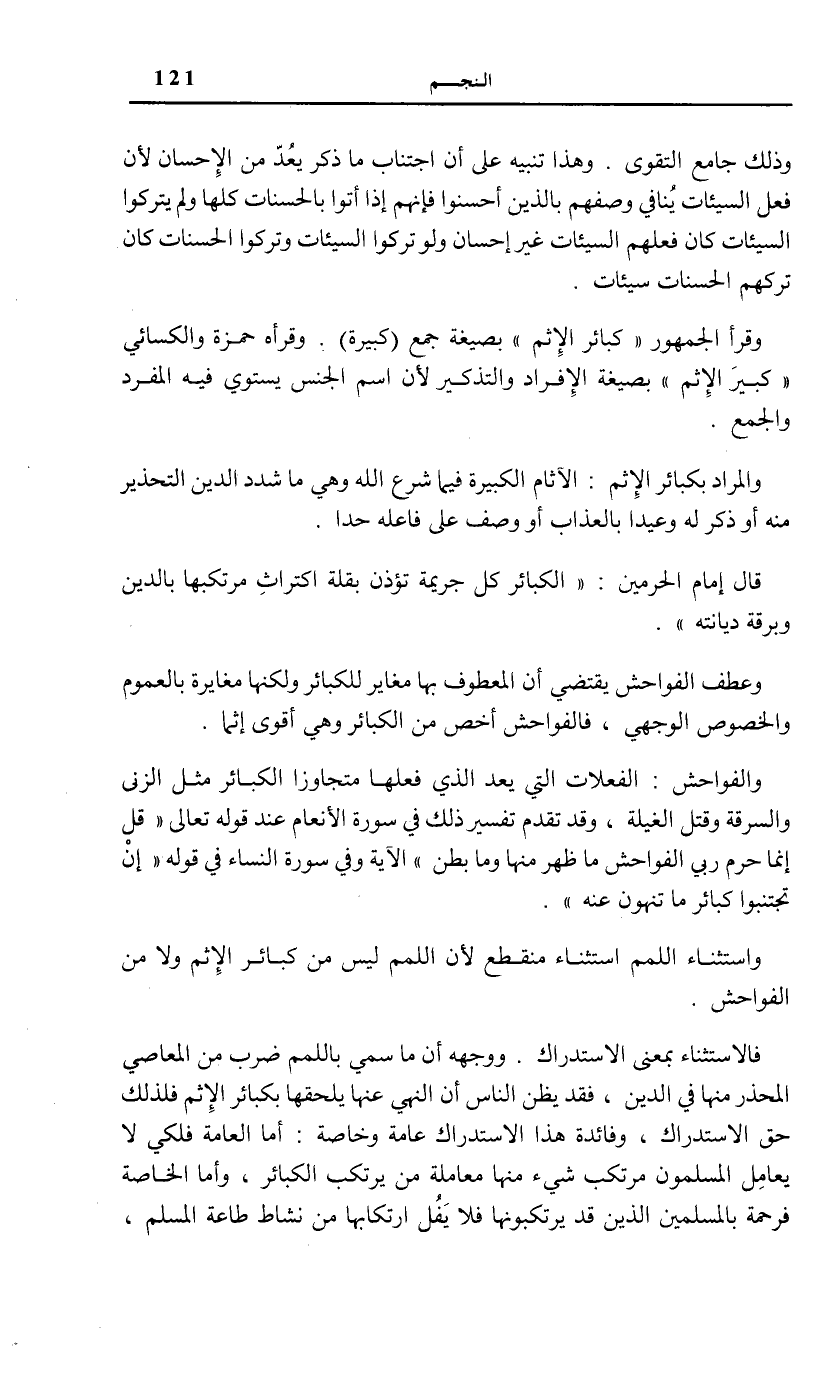 وَالْمُرَادُ بِكَبَائِرِ الْإِثْمِ: الْآثَامُ الْكَبِيرَةُ فِيمَا شَرَعَ اللَّهُ وَهِيَ مَا شَدَّدَ الدِّينُ التَّحْذِيرَ مِنْهُ أَو ذكر لَهُ وَعِيدًا بِالْعَذَابِ أَوْ وَصَفَ عَلَى فَاعِلِهِ حَدًّا.
