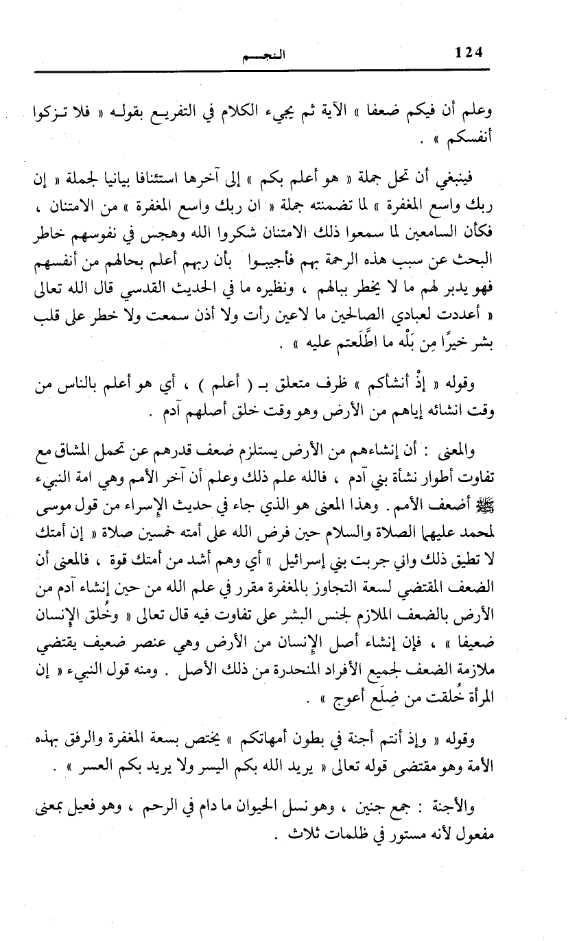 . وَقَوْلُهُ: وَإِذْ أَنْتُمْ أَجِنَّةٌ فِي بُطُونِ أُمَّهاتِكُمْ يَخْتَصُّ بِسِعَةِ الْمَغْفِرَةِ وَالرِّفْقِ بِهَذِهِ الْأمة وَهُوَ متقضى قَوْلِهِ تَعَالَى: يُرِيدُ اللَّهُ بِكُمُ الْيُسْرَ وَلا يُرِيدُ بِكُمُ الْعُسْرَ [الْبَقَرَة: 185] .