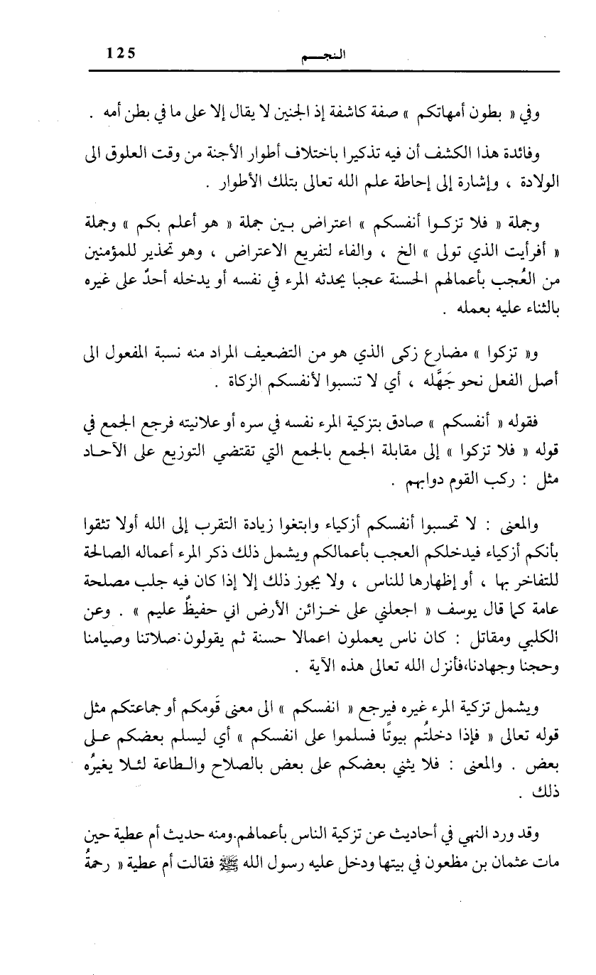 وَجُمْلَةُ فَلا تُزَكُّوا أَنْفُسَكُمْ اعْتِرَاضٌ بَيْنَ جُمْلَةِ هُوَ أَعْلَمُ بِكُمْ وَجُمْلَةُ أَفَرَأَيْتَ الَّذِي تَوَلَّى [النَّجْم: 33] إِلَخْ، وَالْفَاءُ لِتَفْرِيعِ الِاعْتِرَاضِ، وَهُوَ تَحْذِيرٌ لِلْمُؤْمِنِينَ مِنَ الْعُجْبِ بِأَعْمَالِهِمُ الْحَسَنَةِ عَجَبًا يُحْدِثُهُ الْمَرْءُ فِي نَفْسِهِ أَوْ يُدْخِلُهُ أَحَدٌ عَلَى غَيْرِهِ بِالثَّنَاءِ عَلَيْهِ بِعَمَلِهِ.
