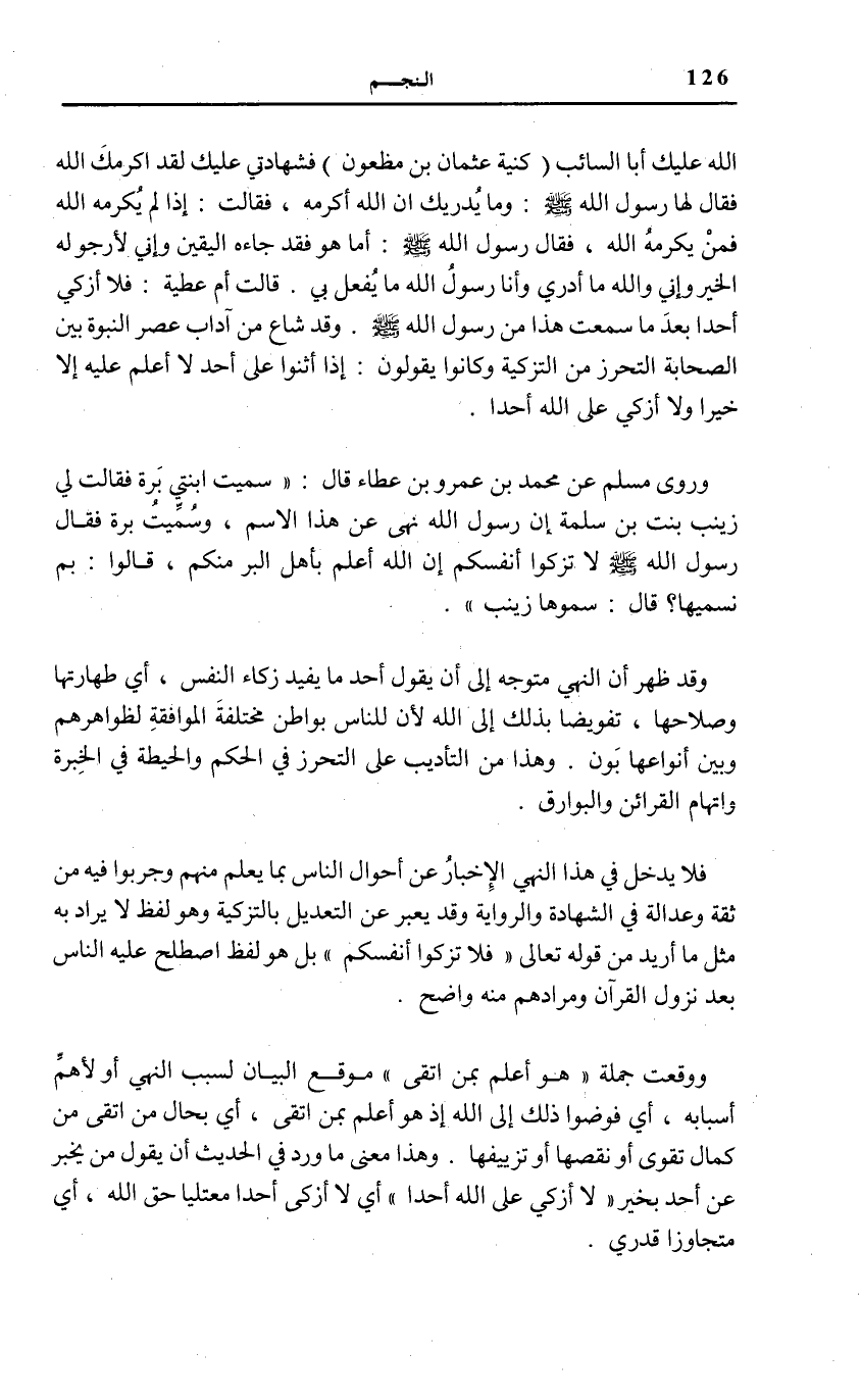 فَلَا يَدْخُلُ فِي هَذَا النَّهْيِ الْإِخْبَارُ عَنْ أَحْوَالِ النَّاسِ بِمَا يُعْلَمُ مِنْهُمْ وَجُرِّبُوا فِيهِ مِنْ ثِقَةٍ وَعَدَالَةٍ فِي الشَّهَادَةِ وَالرِّوَايَةِ وَقَدْ يُعَبَّرُ عَنِ التَّعْدِيلِ بِالتَّزْكِيَةِ وَهُوَ لَفْظٌ لَا يُرَادُ بِهِ مِثْلَ مَا أُرِيدَ مِنْ قَوْلِهِ تَعَالَى: فَلا تُزَكُّوا أَنْفُسَكُمْ بَلْ هُوَ لَفْظٌ اصْطَلَحَ عَلَيْهِ النَّاسُ بَعْدَ نُزُولِ الْقُرْآنِ