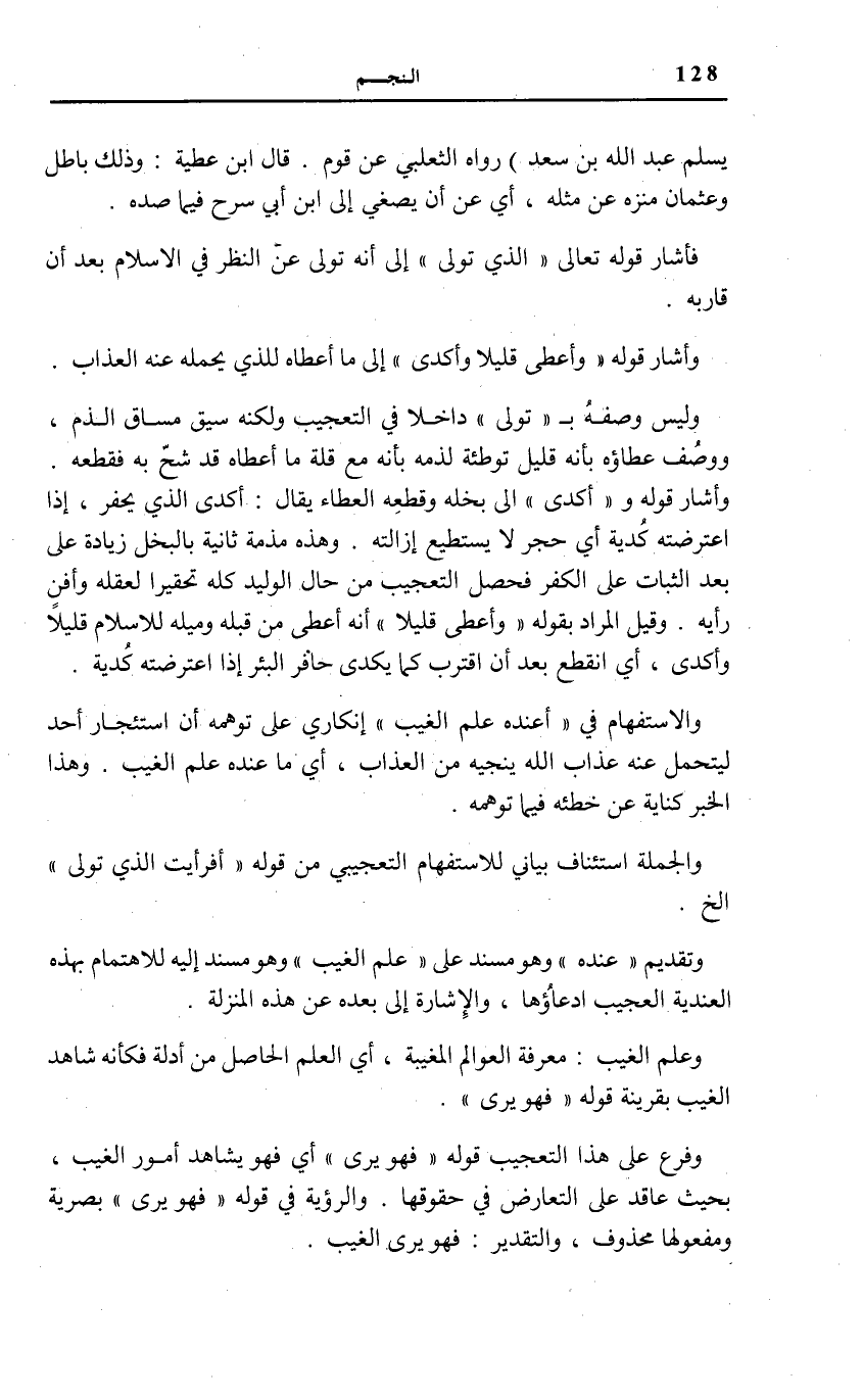 وَلَيْسَ وَصْفُهُ بِ تَوَلَّى دَاخِلًا فِي التَّعْجِيبِ وَلَكِنَّهُ سِيقَ مَسَاقَ الذَّمِّ، وَوُصِفَ عَطَاؤُهُ بِأَنَّهُ قَلِيلٌ تَوْطِئَةٌ لِذَمِّهِ بِأَنَّهُ مَعَ قِلَّةِ مَا أَعْطَاهُ قَدْ شَحَّ بِهِ فَقَطَعَهُ. وَأَشَارَ قَوْلُهُ: وأَكْدى إِلَى بُخْلِهِ وَقَطْعِهِ الْعَطَاءَ يُقَالُ: أَكْدَى الَّذِي يَحْفُرُ، إِذَا اعْتَرَضَتْهُ كُدْيَةٌ أَيْ حَجَرٌ لَا يَسْتَطِيعُ إِزَالَتَهُ. وَهَذِهِ مَذَمَّةٌ ثَانِيَةٌ بِالْبُخْلِ زِيَادَةً عَلَى بُعْدِ الثَّبَاتِ عَلَى الْكُفْرِ فَحَصَلَ التَّعْجِيبُ مِنْ حَالِ الْوَلِيدِ كُلِّهِ تَحْقِيرًا لِعَقْلِهِ وَأَفَنِ رَأْيِهِ. وَقِيلَ الْمُرَادُ بِقَوْلِهِ: وَأَعْطى قَلِيلًا أَنَّهُ أعْطى من قبله وَمَيْلُهُ لِلْإِسْلَامِ قَلِيلًا وَأَكْدَى، أَيِ انْقَطَعَ بَعْدَ أَنِ اقْتَرَبَ كَمَا يُكْدِي حَافِرُ الْبِئْرِ إِذَا اعْتَرَضَتْهُ كُدْيَةٌ.