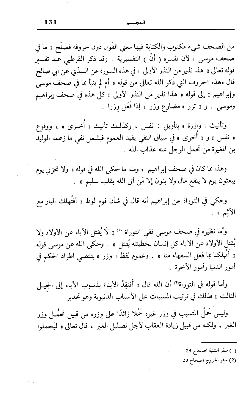 وَأَمَّا نَظِيرُهُ فِي صُحُفِ مُوسَى فَفِي التَّوْرَاةِ (¬1) «لَا يُقْتَلُ الْآبَاءُ عَنِ الْأَوْلَادِ وَلَا يُقْتَلُ الْأَوْلَادُ عَنِ الْآبَاءِ كُلُّ إِنْسَانٍ بِخَطِيئَتِهِ يُقْتَلُ» . وَحَكَى اللَّهُ عَنْ مُوسَى قَوْلَهُ: أَتُهْلِكُنا بِما فَعَلَ السُّفَهاءُ مِنَّا [الْأَعْرَاف: 155] . وَعُمُومُ لَفْظِ وِزْرَ يَقْتَضِي اطِّرَادَ الْحُكْمِ فِي أُمُورِ الدُّنْيَا وَأُمُورِ الْآخِرَةِ.