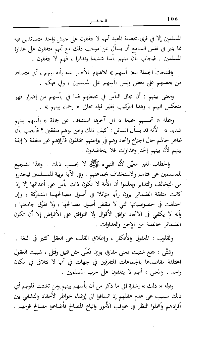 الْمُسْلِمِينَ إِلَّا فِي قُرًى مُحَصَّنَةٍ الْمُفِيدُ أَنَّهُمْ لَا يَتَّفِقُونَ عَلَى جَيْشٍ وَاحِدٍ مُتَسَانِدِينَ فِيهِ مِمَّا يُثِيرُ فِي نَفْسِ السَّامِعِ أَنْ يَسْأَلَ عَنْ مُوجِبِ ذَلِكَ مَعَ أَنَّهُمْ مُتَّفِقُونَ عَلَى عَدَاوَةِ الْمُسْلِمِينَ. فَيُجَابُ بِأَنَّ بَيْنَهُمْ بَأْسًا شَدِيدًا وَتَدَابُرًا، فَهُمْ لَا يَتَّفِقُونَ.