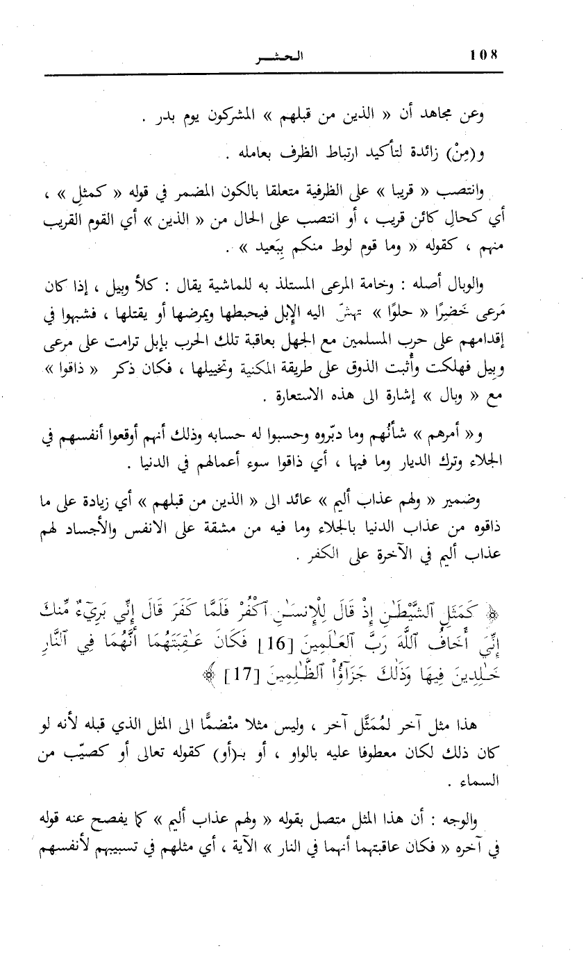 وَالْوَجْهُ: أَنَّ هَذَا الْمَثَلَ مُتَّصِلٌ بِقَوْلِهِ: وَلَهُمْ عَذابٌ أَلِيمٌ [الْحَشْر: 15] كَمَا يُفْصِحُ عَنْهُ قَوْلُهُ فِي آخِرِهِ: فَكانَ عاقِبَتَهُما أَنَّهُما فِي النَّارِ الْآيَةَ، أَيْ مثلهم فِي تسبيبهم لِأَنْفُسِهِمْ