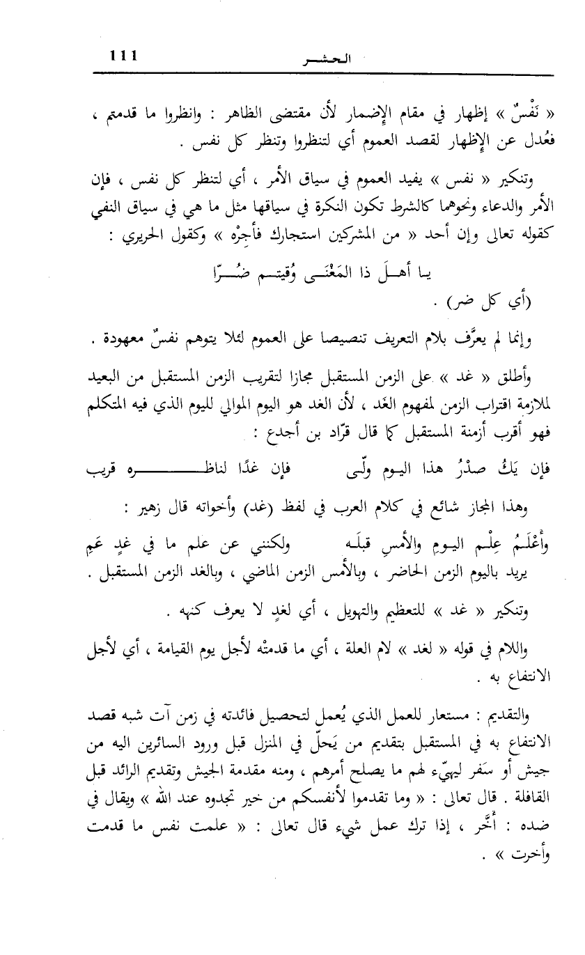 وَهَذَا الْمَجَازُ شَائِعٌ فِي كَلَامِ الْعَرَبِ فِي لَفْظِ (غَدٍ) وَأَخَوَاتِهِ قَالَ زُهَيْرٌ: