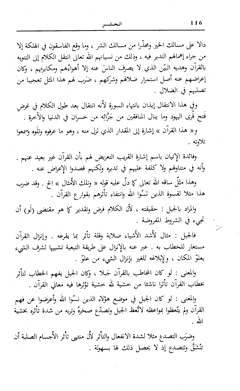 دَالًّا عَلَى مَسَالِكِ الْخَيْرِ وَمُحَذِّرًا مِنْ مَسَالِكِ الشَّرِّ، وَمَا وَقَعَ الْفَاسِقُونَ فِي الْهَلَكَةِ إِلَّا مِنْ جَرَّاءِ إِهْمَالِهِمُ التَّدَبُّرَ فِيهِ، وَذَلِكَ مِنْ نِسْيَانِهِمُ اللَّهَ تَعَالَى انْتَقَلَ الْكَلَامُ إِلَى التَّنْوِيهِ بِالْقُرْآنِ وَهَدْيِهِ الْبَيِّنِ الَّذِي لَا يَصْرِفُ النَّاسَ عَنهُ إِلَّا أهواؤهم وَمُكَابَرَتُهُمْ، وَكَانَ إِعْرَاضُهُمْ عَنْهُ أَصْلَ اسْتِمْرَارِ ضَلَالِهِمْ وَشِرْكِهِمْ، ضَرَبَ لَهُمْ هَذَا الْمَثَلَ تَعْجِيبًا مِنْ تَصَلُّبِهِمْ فِي الضَّلَالِ.