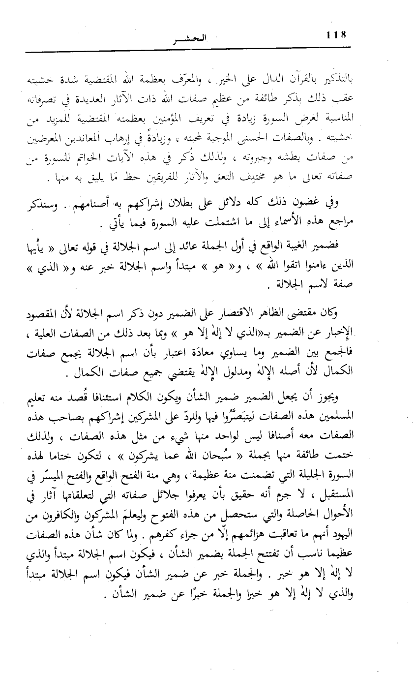 وَيَجُوزُ أَنْ يُجْعَلَ الضَّمِيرُ ضَمِيرَ الشَّأْنِ وَيَكُونُ الْكَلَامُ اسْتِئْنَافًا قُصِدَ مِنْهُ تَعْلِيمُ الْمُسْلِمِينَ هَذِهِ الصِّفَاتِ لِيَتَبَصَّرُوا فِيهَا وَلِلرَّدِّ عَلَى الْمُشْرِكِينَ إِشْرَاكِهِمْ بِصَاحِبِ هَذِهِ الصِّفَاتِ مَعَهُ أَصْنَافًا لَيْسَ لِوَاحِدٍ مِنْهَا شَيْءٌ مِنْ مِثْلِ هَذِهِ الصِّفَاتِ، وَلِذَلِكَ خُتِمَتْ طَائِفَةٌ مِنْهَا بِجُمْلَةِ سُبْحانَ اللَّهِ عَمَّا يُشْرِكُونَ [الْحَشْر: 23] ، لتَكون ختاما لِهَذِهِ السُّورَةِ الْجَلِيلَةِ الَّتِي تَضَمَّنَتْ مِنَّةً عَظِيمَةً، وَهِيَ مِنَّةُ الْفَتْحِ الْوَاقِعِ وَالْفَتْحِ الْمُيَسَّرِ فِي الْمُسْتَقْبَلِ، لَا جَرَمَ أَنَّهُ حَقِيقٌ بِأَنْ