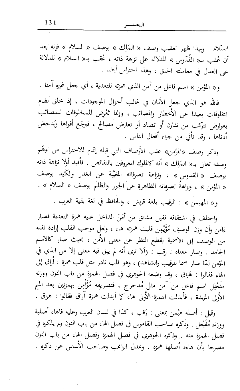 (أَلَا تَرَى أَنَّهُ لَمْ يَبْقَ فِيهِ مَعْنًى إِلَّا من الَّذين فِي الْمُؤْمِنِ لَمَّا صَارَ اسْمًا لِلرَّقِيبِ وَالشَّاهِدِ) ، وَهُوَ قَلْبٌ نَادِرٌ مِثْلُ قَلْبِ هَمْزَةِ: أَرَاقَ إِلَى الْهَاءِ فَقَالُوا: هَرَاقَ، وَقَدْ وَضَعَهُ الْجَوْهَرِيُّ فِي فَصْلِ الْهَمْزَةِ مِنْ بَابِ النُّونِ وَوَزْنُهُ مُفَعْلِلٌ اسْمُ فَاعِلٍ مِنْ آمَنَ مِثْلِ مُدَحْرِجٍ، فَتَصْرِيفُهُ مُؤَأْمِنٌ بِهَمْزَتَيْنِ بَعْدَ الْمِيمِ الْأُولَى الْمَزِيدَةِ، فَأُبْدِلَتِ الْهَمْزَةُ الْأُولَى هَاءً كَمَا أُبْدِلَتْ هَمْزَةُ أرَاقَ فَقَالُوا: هَرَاقَ.