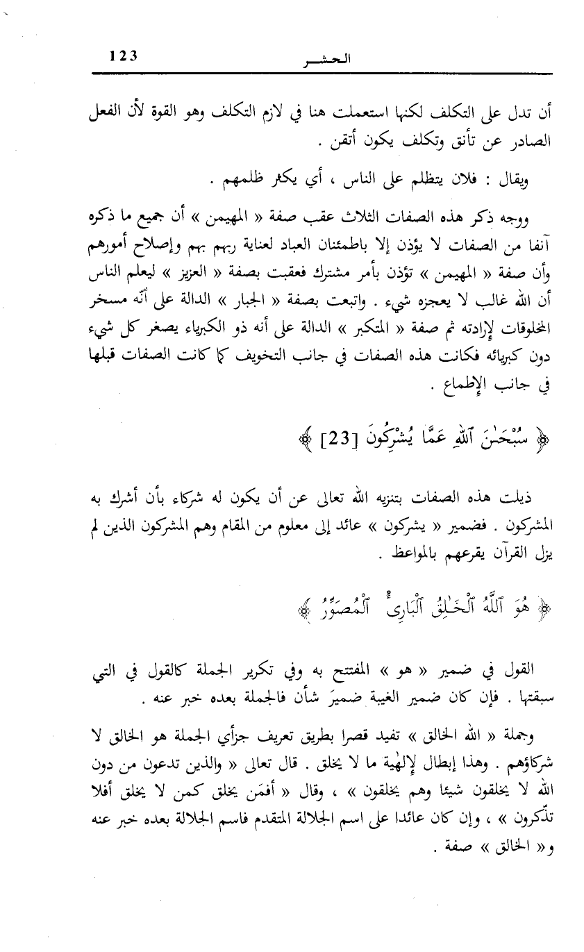 شَيْءٌ. وَاتُّبِعَتْ بِصِفَةِ الْجَبَّارُ الدَّالَّةِ عَلَى أَنَّهُ مُسَخِّرُ الْمَخْلُوقَاتِ لِإِرَادَتِهِ ثُمَّ صِفَةِ الْمُتَكَبِّرُ الدَّالَّةِ عَلَى أَنَّهُ ذُو الْكِبْرِيَاءِ يَصْغُرُ كُلُّ شَيْءٍ دُونَ كِبْرِيَائِهِ فَكَانَتْ هَذِهِ الصِّفَاتِ فِي جَانِبِ التَّخْوِيفِ كَمَا كَانَت الصِّفَات قَبْلَهَا فِي جَانِبِ الْإِطْمَاعِ.