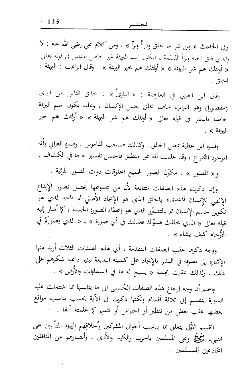 وَفَسَّرَهُ ابْنُ عَطِيَّةَ بِمَعْنَى الْخَالِقِ. وَكَذَلِكَ صَاحَبُ «الْقَامُوسِ» . وَفَسَّرَهُ الْغَزَالِيُّ بِأَنَّهُ الْمَوْجُودُ الْمُخْتَرِعُ، وَقَدْ عَلِمْتَ أَنَّهُ غَيْرُ مُنْطَبِقٍ فَأَحْسَنُ تَفْسِيرٍ لَهُ مَا فِي «الْكَشَّافِ» .