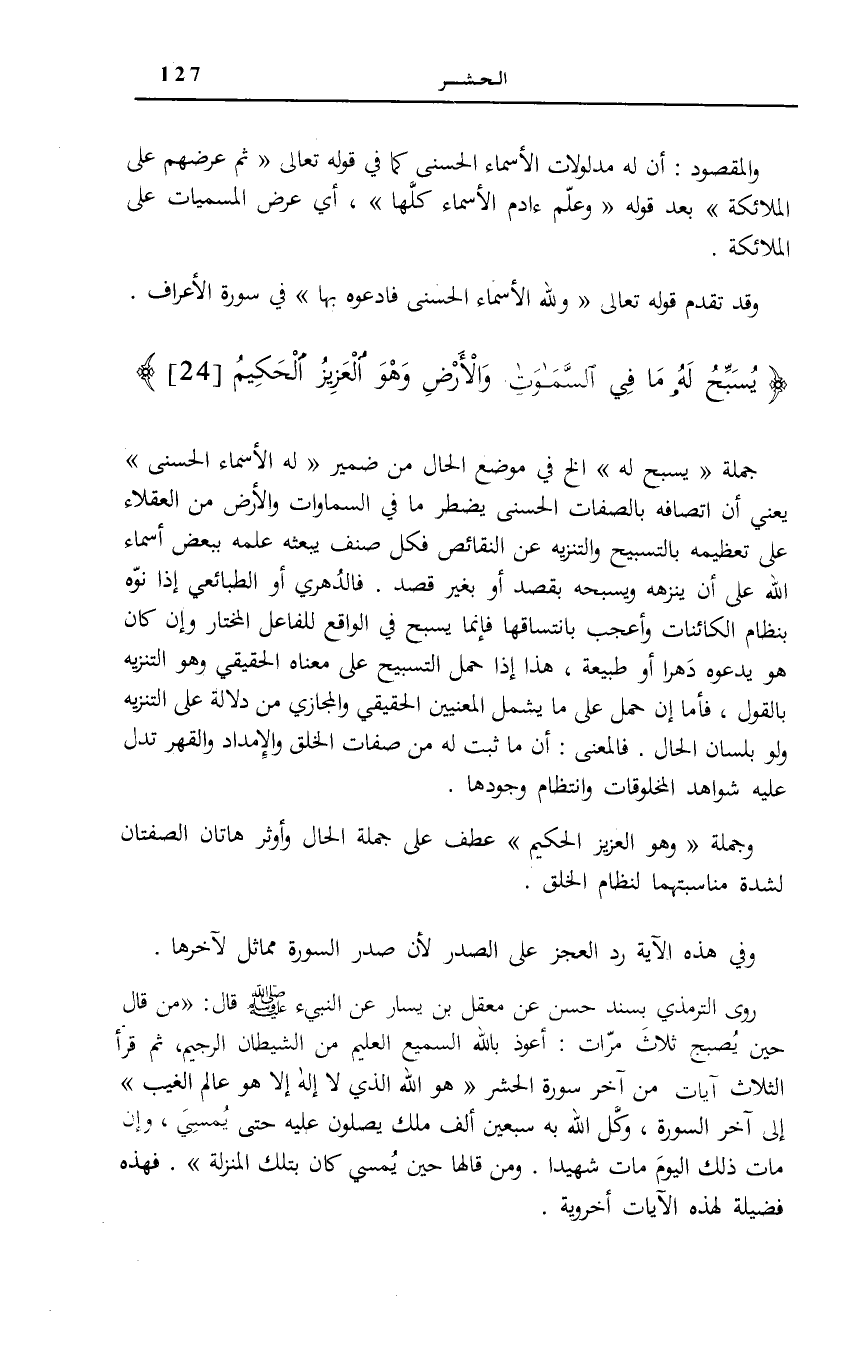 رَوَى التِّرْمِذِيُّ بِسَنَدٍ حَسَنٍ عَنْ مَعْقِلِ بْنِ يَسَارٍ عَن النبيء صَلَّى اللهُ عَلَيْهِ وَسَلَّمَ قَالَ: «مَنْ قَالَ حِينَ يُصْبِحُ ثَلَاثَ مَرَّاتٍ: أَعُوذُ بِاللَّهِ السَّمِيعِ الْعَلِيمِ مِنَ الشَّيْطَانِ الرَّجِيمِ، ثُمَّ قَرَأَ الثَّلَاثَ آيَاتٍ مِنْ آخَرِ سُورَةَ الْحَشْرِ هُوَ اللَّهُ الَّذِي لَا إِلهَ إِلَّا هُوَ عالِمُ الْغَيْبِ [الْحَشْر: 22] إِلَى آخَرِ السُّورَةِ، وَكَّلَ اللَّهُ بِهِ سَبْعِينَ أَلْفَ مَلَكٍ يُصَلُّونَ عَلَيْهِ حَتَّى يُمْسِيَ، وَإِنْ مَاتَ ذَلِكَ الْيَوْمَ مَاتَ شَهِيدًا.