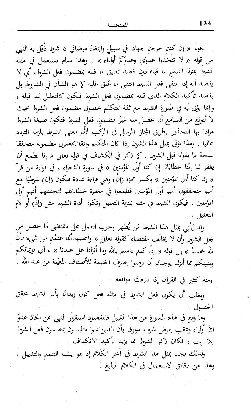 وَقَوْلُهُ: إِنْ كُنْتُمْ خَرَجْتُمْ جِهاداً فِي سَبِيلِي وَابْتِغاءَ مَرْضاتِي شَرْطٌ ذُيِّلَ بِهِ النَّهْيُ مِنْ قَوْلِهِ: لَا تَتَّخِذُوا عَدُوِّي وَعَدُوَّكُمْ أَوْلِياءَ. وَهَذَا مَقَامٌ يُسْتَعْمَلُ فِي مِثْلِهِ الشَّرْطُ بِمَنْزِلَةِ التَّتْمِيمِ لِمَا قَبْلَهُ دُونَ قَصْدِ تَعْلِيقِ مَا قَبْلَهُ بِمَضْمُونِ فِعْلِ الشَّرْطِ، أَيْ لَا يُقْصَدُ أَنَّهُ إِذَا انْتَفَى فِعْلُ الشَّرْطِ انْتَفَى مَا عُلِّقَ عَلَيْهِ كَمَا هُوَ الشَّأْنُ فِي الشُّرُوطِ بَلْ يَقْصِدُ تَأْكِيدَ الْكَلَامِ الَّذِي قَبْلَهُ بِمَضْمُونِ فِعْلِ الشَّرْطِ فَيَكُونُ كَالتَّعْلِيلِ لِمَا قَبْلَهُ، وَإِنَّمَا يُؤْتَى بِهِ فِي صُورَةِ الشَّرْطِ مَعَ ثِقَةِ الْمُتَكَلِّمِ بِحُصُولِ مَضْمُونِ فِعْلِ الشَّرْطِ بِحَيْثُ لَا يُتَوَقَّعُ مِنَ السَّامِعِ أَنْ يَحْصُلَ مِنْهُ غَيْرُ مَضْمُونِ فِعْلِ الشَّرْطِ فَتَكُونُ صِيغَةُ الشَّرْطِ مُرَادًا بِهَا التَّحْذِيرُ بِطَرِيقِ الْمَجَازِ الْمُرْسَلِ فِي الْمُرَكَّبِ لِأَنَّ مَعْنَى الشَّرْطِ يَلْزَمُهُ التَّرَدُّدُ غَالِبًا. وَلِهَذَا يُؤْتَى بِمِثْلِ هَذَا الشَّرْطِ إِذَا كَانَ الْمُتَكَلِّمُ وَاثِقًا بِحُصُولِ مَضْمُونِهِ مُتَحَقِّقًا صِحَّةَ مَا يَقُولُهُ قَبْلَ الشَّرْطِ. كَمَا ذُكِرَ فِي «الْكَشَّافِ» فِي قَوْلِهِ تَعَالَى: إِنَّا نَطْمَعُ أَنْ يَغْفِرَ لَنا رَبُّنا خَطايانا أَنْ كُنَّا أَوَّلَ الْمُؤْمِنِينَ فِي سُورَةِ الشُّعَرَاءِ [51] ، فِي قِرَاءَةِ مَنْ قَرَأَ أَنْ كُنَّا أَوَّلَ الْمُؤْمِنِينَ بِكَسْرِ هَمْزَةِ (إِنَّ) وَهِيَ قِرَاءَةٌ شَاذَّةٌ فَتَكُونُ (إِنْ) شَرْطِيَّةٌ مَعَ أَنَّهُمْ مُتَحَقِّقُونَ أَنَّهُمْ أَوَّلُ الْمُؤْمِنِينَ فَطَمِعُوا فِي مَغْفِرَةِ خَطَايَاهُمْ لِتَحَقُّقِهِمْ أَنَّهُمْ أَوَّلُ الْمُؤْمِنِينَ، فَيَكُونُ الشَّرْطُ فِي مِثْلِهِ بِمَنْزِلَةِ التَّعْلِيلِ وَتَكُونُ أَدَاةُ الشَّرْطِ مِثْلَ (إِذْ) أَوْ لَامِ التَّعْلِيلِ.