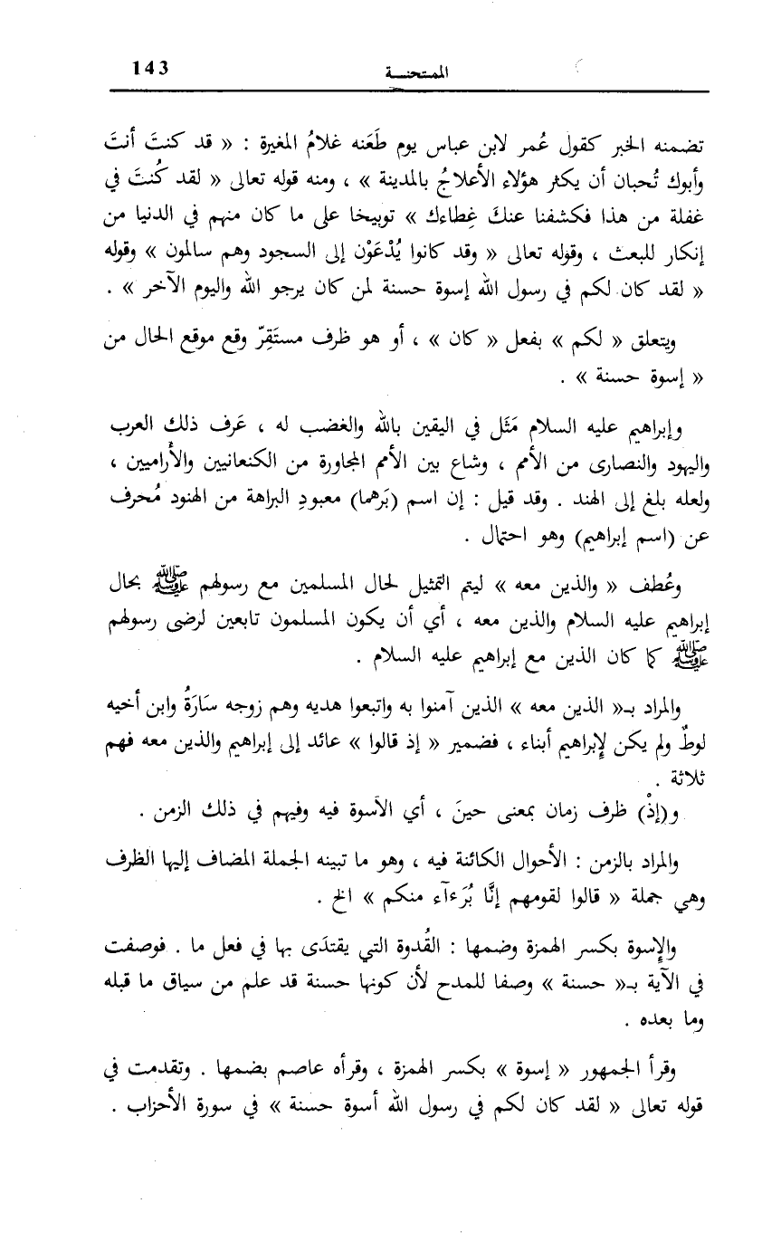 وَقَرَأَ الْجُمْهُورُ إِسْوَةٌ بِكَسْرِ الْهَمْزَةِ، وَقَرَأَهُ عَاصِمٌ بِضَمِّهَا. وَتَقَدَّمَتْ فِي قَوْلِهِ تَعَالَى: لَقَدْ كانَ لَكُمْ فِي رَسُولِ اللَّهِ أُسْوَةٌ حَسَنَةٌ فِي سُورَةِ الْأَحْزَابِ