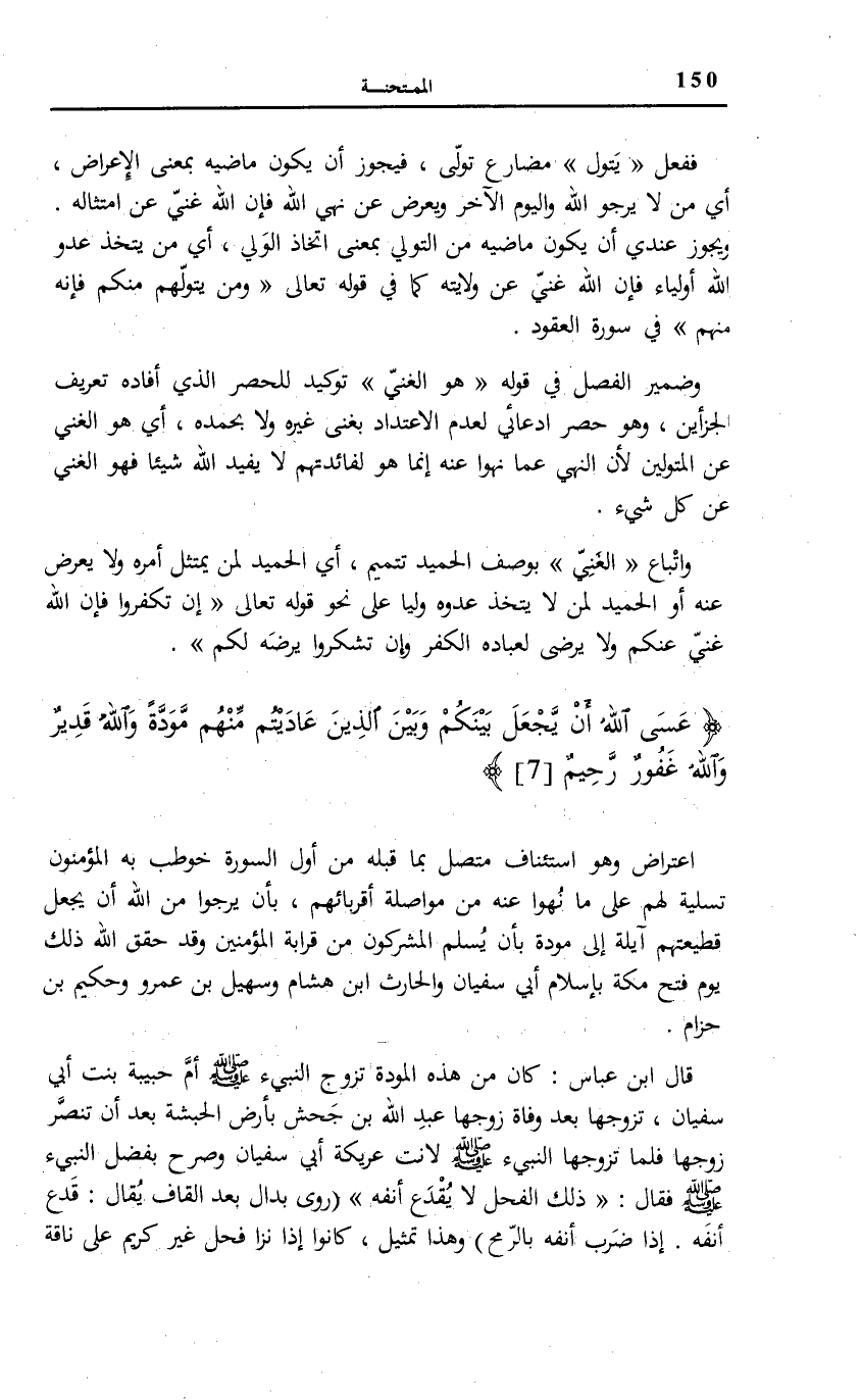 قَالَ ابْنُ عَبَّاسٍ: كَانَ مِنْ هَذِهِ الْمَوَدَّةِ تزوج النبيء صَلَّى اللهُ عَلَيْهِ وَسَلَّمَ أَمَّ حَبِيبَةَ بِنْتِ أَبِي سُفْيَانَ، تَزَوَّجَهَا بَعْدَ وَفَاةِ زَوْجِهَا عَبْدِ اللَّهِ بْنِ جَحْشٍ بِأَرْضِ الْحَبَشَةِ بَعْدَ أَنْ تَنَصَّرَ زَوْجُهَا فَلَمَّا تزَوجهَا النبيء صَلَّى اللهُ عَلَيْهِ وَسَلَّمَ لَانَتْ عَرِيكَةُ أَبِي سُفْيَانَ وَصَرَّحَ بِفضل النبيء صَلَّى اللهُ عَلَيْهِ وَسَلَّمَ فَقَالَ: «ذَلِكَ الْفَحْلُ لَا يُقْدَعُ أَنْفُهُ»
