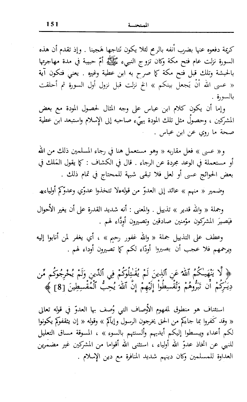 لَا يَنْهاكُمُ اللَّهُ عَنِ الَّذِينَ لَمْ يُقاتِلُوكُمْ فِي الدِّينِ وَلَمْ يُخْرِجُوكُمْ مِنْ دِيارِكُمْ أَنْ تَبَرُّوهُمْ وَتُقْسِطُوا إِلَيْهِمْ إِنَّ اللَّهَ يُحِبُّ الْمُقْسِطِينَ (8)