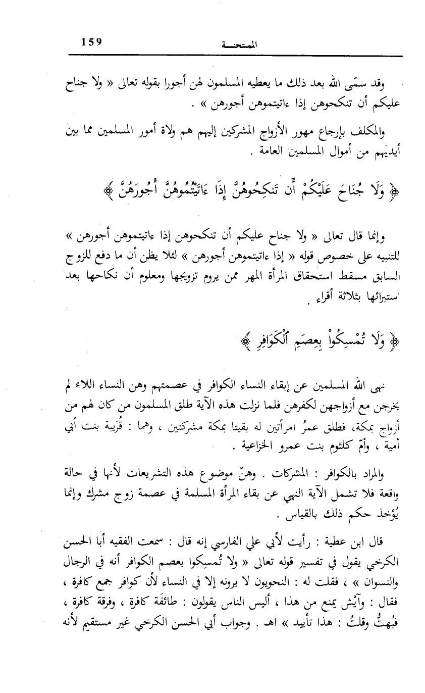 قَالَ ابْنُ عَطِيَّةَ: رَأَيْتُ لِأَبِي عَلِيٍّ الْفَارِسِيِّ أَنَّهُ قَالَ: سَمِعْتُ الْفَقِيهَ أَبَا الْحَسَنِ الْكَرْخِيَّ يَقُولُ فِي تَفْسِيرِ قَوْلِهِ تَعَالَى: وَلا تُمْسِكُوا بِعِصَمِ الْكَوافِرِ أَنَّهُ فِي الرِّجَالِ وَالنِّسْوَانِ، فَقُلْتُ لَهُ: النَّحْوِيُّونَ لَا يَرَوْنَهُ إِلَّا فِي النِّسَاءِ لِأَنَّ كَوَافِرَ جُمَعُ كَافِرَةٍ، فَقَالَ: وَآيْشُ يَمْنَعُ مِنْ هَذَا، أَلَيْسَ النَّاسُ يَقُولُونَ: طَائِفَةٌ كَافِرَةٌ، وَفِرْقَةٌ كَافِرَةٌ، فَبُهِتُّ وَقُلْتُ: هَذَا تَأْيِيدٌ اه.