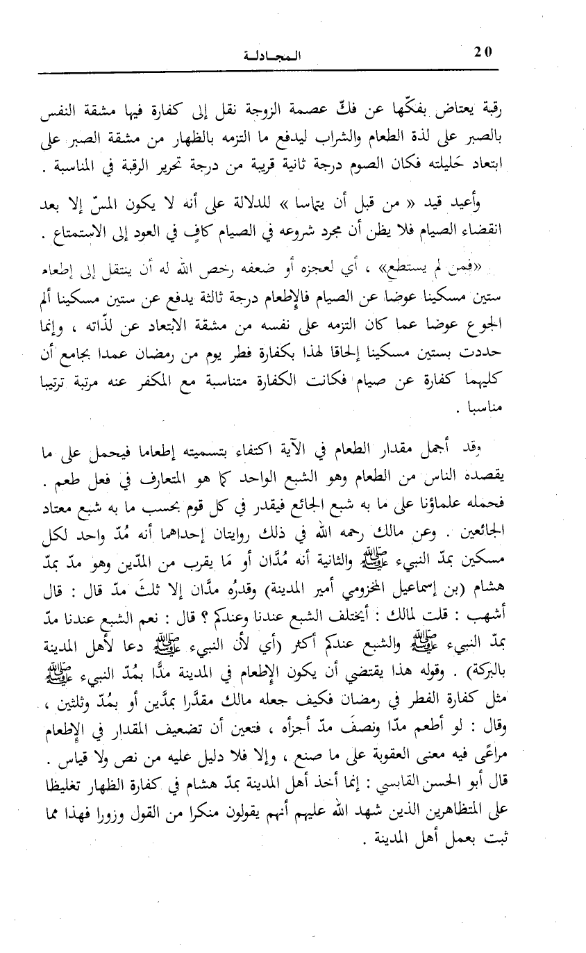 وَقَدْ أُجْمِلَ مِقْدَارُ الطَّعَامِ فِي الْآيَةِ اكْتِفَاءً بِتَسْمِيَتِهِ إِطْعَامًا فَيُحْمَلُ عَلَى مَا يَقْصِدُهُ النَّاسُ مِنَ الطَّعَامِ وَهُوَ الشِّبَعُ الْوَاحِدُ كَمَا هُوَ الْمُتَعَارَفُ فِي فِعْلِ طَعِمَ. فَحَمَلَهُ عُلَمَاؤُنَا عَلَى مَا بِهِ شِبَعُ الْجَائِعِ فَيُقَدَّرُ فِي كُلِّ قَوْمٍ بِحَسْبِ مَا بِهِ شِبَعُ مُعْتَادِ الْجَائِعِينَ. وَعَنْ مَالِكٍ رَحِمَهُ اللَّهُ فِي ذَلِكَ رِوَايَتَانِ، إِحْدَاهُمَا: أَنَّهُ مُدٌّ وَاحِدٌ لِكُلِّ مِسْكِينٍ بمدّ النبيء صَلَّى اللهُ عَلَيْهِ وَسَلَّمَ وَالثَّانِيَةُ: أَنَّهُ مُدَّانِ أَوْ مَا يَقْرُبُ مِنَ الْمُدَّيْنِ وَهُوَ مُدٌّ بِمُدِّ هِشَامِ (بْنِ إِسْمَاعِيلَ الْمَخْزُومِيِّ أَمِيرِ الْمَدِينَةِ) وَقَدْرُهُ مُدَّانِ إِلَّا ثُلُثَ مُدٍّ قَالَ: قَالَ أَشْهَبُ: قُلْتُ لِمَالِكٍ: أَيَخْتَلِفُ الشِّبَعُ عِنْدَنَا وَعِنْدَكُمْ؟ قَالَ: نَعَمِ الشِّبَعُ عِنْدَنَا مُدٌّ بمدّ النبيء صَلَّى اللهُ عَلَيْهِ وَسَلَّمَ وَالشِّبَعُ عِنْدَكُمْ أَكْثَرُ (أَيْ لِأَن النبيء صَلَّى اللهُ عَلَيْهِ وَسَلَّمَ دَعَا لِأَهْلِ الْمَدِينَةِ بِالْبَرَكَةِ) . وَقَوْلُهُ هَذَا يَقْتَضِي أَنْ يَكُونَ الْإِطْعَامُ فِي الْمَدِينَةِ مُدًّا بمدّ النبيء صَلَّى اللهُ عَلَيْهِ وَسَلَّمَ مِثْلُ كَفَّارَةِ الْفِطْرِ فِي رَمَضَانَ فَكَيْفَ جَعَلَهُ مَالِكٌ مُقَدَّرًا بِمُدَّيْنِ أَوْ بِمُدٍّ وَثُلُثَيْنِ، وَقَالَ: لَوْ أَطْعَمَ مُدًّا وَنِصْفَ مُدٍّ أَجْزَأَهُ. فَتَعَيَّنَ أَنَّ تَضْعِيفَ الْمِقْدَارِ فِي الْإِطْعَامِ مُرَاعًى فِيهِ مَعْنَى الْعُقُوبَةُ عَلَى مَا صَنَعَ، وَإِلَّا فَلَا دَلِيلَ عَلَيْهِ مِنْ نَصٍّ وَلَا قِيَاسٍ. قَالَ أَبُو الْحَسَنِ الْقَابِسِيُّ: إِنَّمَا أَخَذَ أَهْلُ الْمَدِينَةِ بِمُدِّ هِشَامٍ فِي كَفَّارَةِ الظِّهَارِ تَغْلِيظًا عَلَى الْمُتَظَاهِرِينَ الَّذِينَ شَهِدَ اللَّهُ عَلَيْهِمْ أَنَّهُمْ يَقُولُونَ مُنْكَرًا مِنَ الْقَوْلِ وَزُورًا فَهَذَا مِمَّا ثَبَتَ بِعَمَلِ أَهْلِ الْمَدِينَةِ.