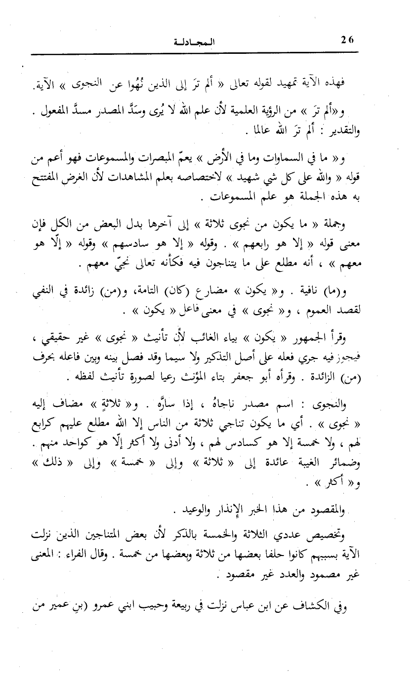 وَالنَّجْوَى: اسْمُ مَصْدَرِ نَاجَاهُ، إِذَا سَارَّهُ. وثَلاثَةٍ مُضَافٌ إِلَيْهِ نَجْوى. أَيْ مَا يَكُونُ تَنَاجِي ثَلَاثَةٍ مِنَ النَّاسِ إِلَّا اللَّهُ مُطَّلِعٌ عَلَيْهِمْ كَرَابِعٍ لَهُمْ، وَلَا خَمْسَةٍ إِلَّا هُوَ كَسَادِسٍ لَهُمْ، وَلَا أَدْنَى وَلَا أَكْثَرَ إِلَّا هُوَ كَوَاحِدٍ مِنْهُمْ. وَضَمَائِرُ الْغَيْبَةِ عَائِدَةٌ إِلَى ثَلاثَةٍ وَإِلَى خَمْسَةٍ وَإِلَى ذلِكَ وأَكْثَرَ.