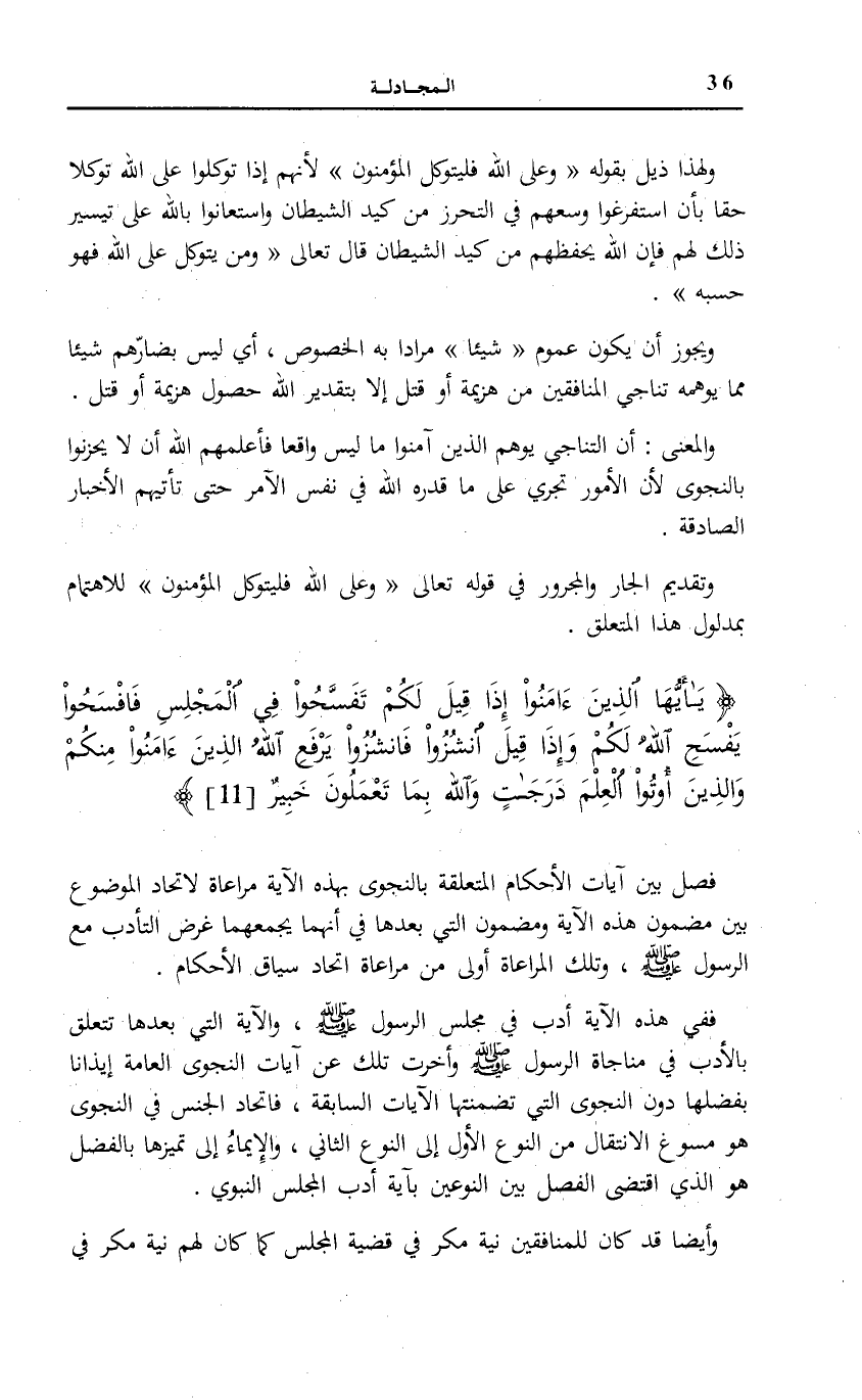 فَفِي هَذِهِ الْآيَةِ أَدَبٌ فِي مجْلِس الرَّسُول صَلَّى اللهُ عَلَيْهِ وَسَلَّمَ، وَالْآيَةُ الَّتِي بَعْدَهَا تَتَعَلَّقُ بِالْأَدَبِ فِي مُنَاجَاة الرَّسُول صَلَّى اللهُ عَلَيْهِ وَسَلَّمَ، وأخرت تِلْكَ عَنْ آيَاتِ النَّجْوَى الْعَامَّةِ إِيذَانًا بِفَضْلِهَا دُونَ النَّجْوَى الَّتِي تَضَمَّنَتْهَا الْآيَاتُ السَّابِقَةُ، فَاتِّحَادُ الْجِنْسِ فِي النَّجْوَى هُوَ مُسَوِّغُ الِانْتِقَالِ مِنَ النَّوْعِ الْأَوَّلِ إِلَى النَّوْعِ الثَّانِي، وَالْإِيمَاءُ إِلَى تَمَيُّزِهَا بِالْفَضْلِ هُوَ الَّذِي اقْتَضَى الْفَصْلَ بَيْنَ النَّوْعَيْنِ بِآيَةِ أَدَبِ الْمَجْلِسِ النَّبَوِيِّ.