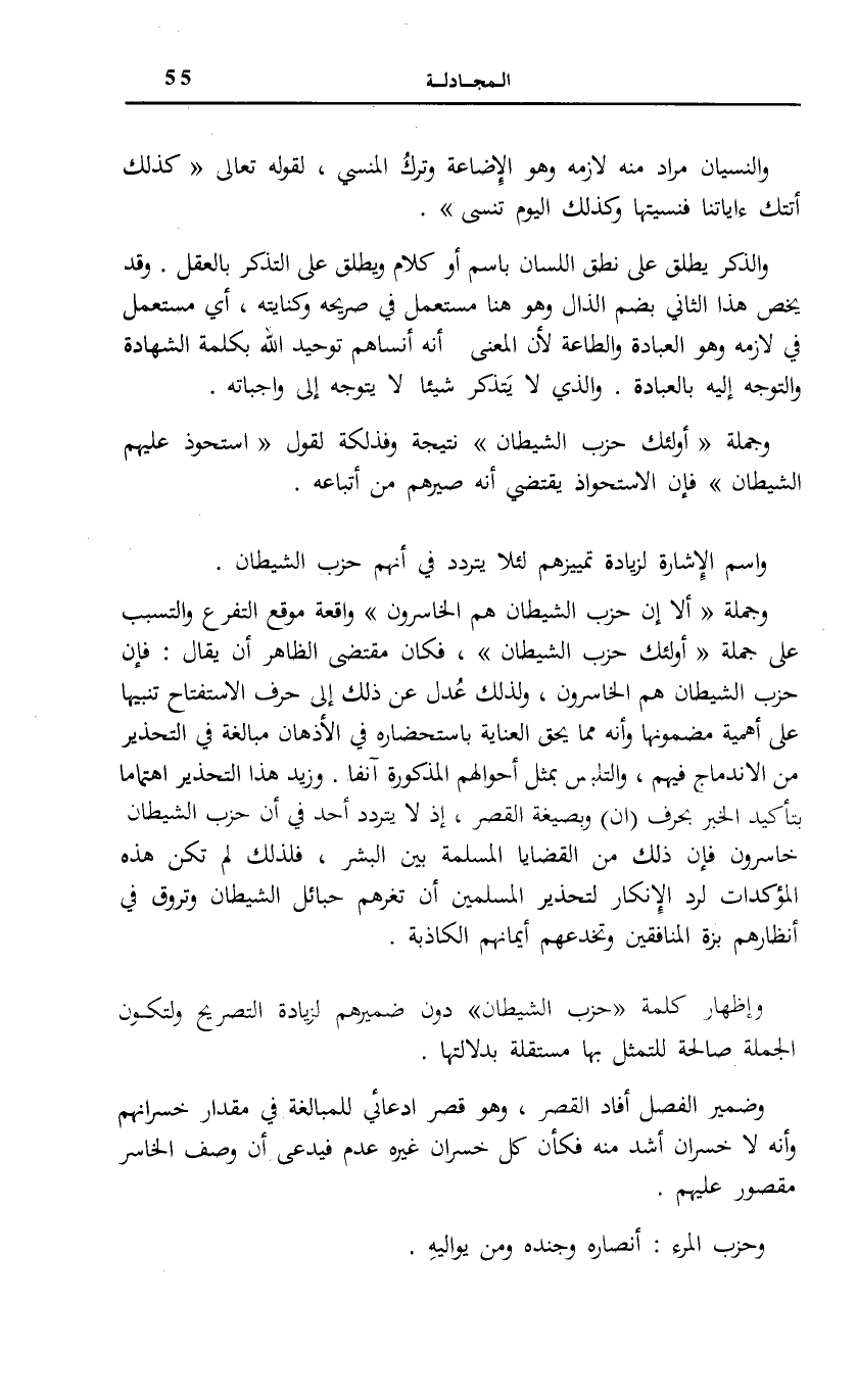 وَجُمْلَةُ أَلا إِنَّ حِزْبَ الشَّيْطانِ هُمُ الْخاسِرُونَ وَاقِعَةٌ مَوْقِعَ التَّفَرُّعِ وَالتَّسَبُّبِ عَلَى جُمْلَةِ أُولئِكَ حِزْبُ الشَّيْطانِ، فَكَانَ مُقْتَضَى الظَّاهِرِ أَنْ يُقَالَ: فَإِنَّ حِزْبَ الشَّيْطَانِ هم الخاسرون، وَلذَلِك عَدَلَ عَنْ ذَلِكَ إِلَى حَرْفِ الِاسْتِفْتَاحِ تَنْبِيهًا عَلَى أَهَمِّيَّةِ مَضْمُونِهَا وَأَنَّهُ