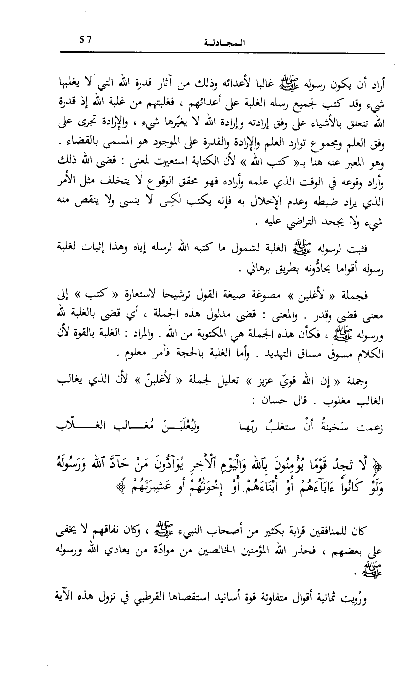 فَثَبت لرَسُوله صَلَّى اللهُ عَلَيْهِ وَسَلَّمَ الْغَلَبَةُ لِشِمُولِ مَا كَتَبَهُ اللَّهُ لِرُسُلِهِ إِيَّاهُ وَهَذَا إِثْبَاتٌ لِغَلَبَةِ رَسُولِهِ أَقْوَامًا يُحَادُّونَهُ بِطَرِيقٍ بُرْهَانِيٍّ.