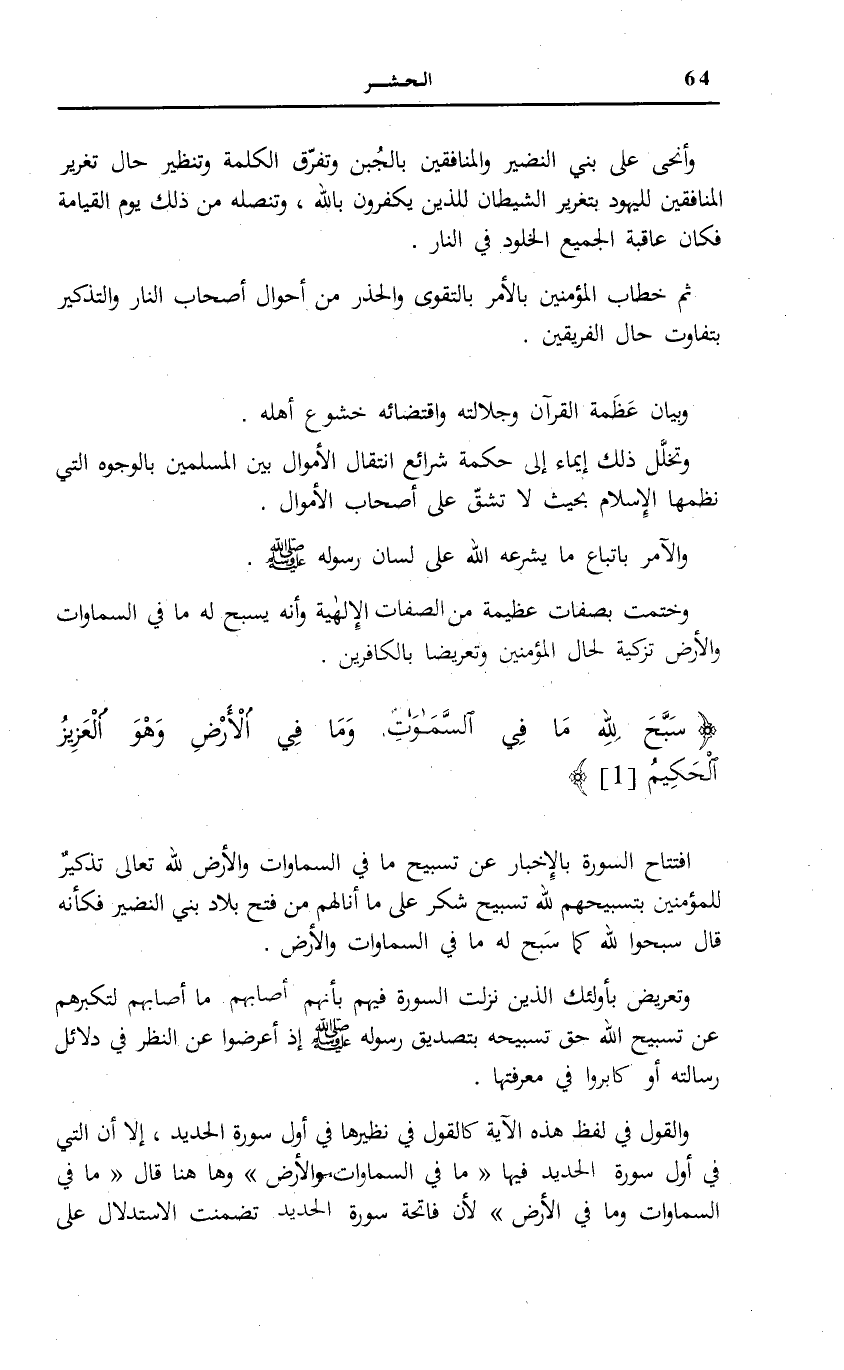 افْتِتَاحُ السُّورَةِ بِالْإِخْبَارِ عَنْ تَسْبِيحِ مَا فِي السَّمَاوَاتِ وَالْأَرْضِ لِلَّهِ تَعَالَى تَذْكِيرٌ لِلْمُؤْمِنِينَ بِتَسْبِيحِهِمْ لِلَّهِ تَسْبِيحَ شُكْرٍ عَلَى مَا أَنَالَهُمْ مِنْ فَتْحِ بِلَادِ بَنِي النَّضِيرِ فَكَأَنَّهُ قَالَ سَبِّحُوا لِلَّهِ كَمَا سَبَّحَ لَهُ مَا فِي السَّمَاوَاتِ وَالْأَرْضِ.