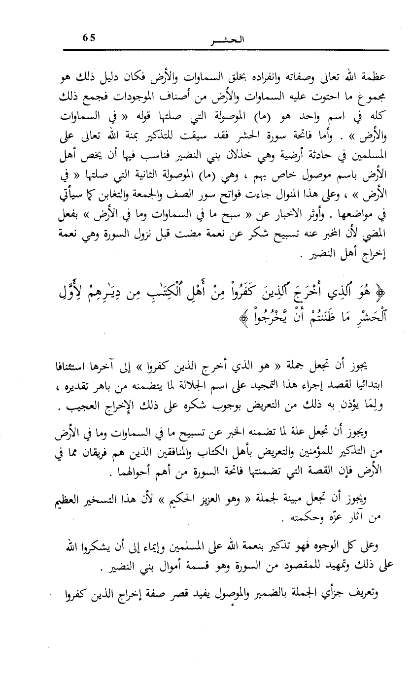 وَعَلَى كُلِّ الْوُجُوهِ فَهُوَ تَذْكِيرٌ بِنِعْمَةِ اللَّهِ عَلَى الْمُسْلِمِينَ وَإِيمَاءٌ إِلَى أَنْ يَشْكُرُوا اللَّهَ عَلَى ذَلِكَ وَتَمْهِيدٌ لِلْمَقْصُودِ مِنَ السُّورَةِ وَهُوَ قِسْمَةُ أَمْوَالِ بَنِي النَّضِيرِ.