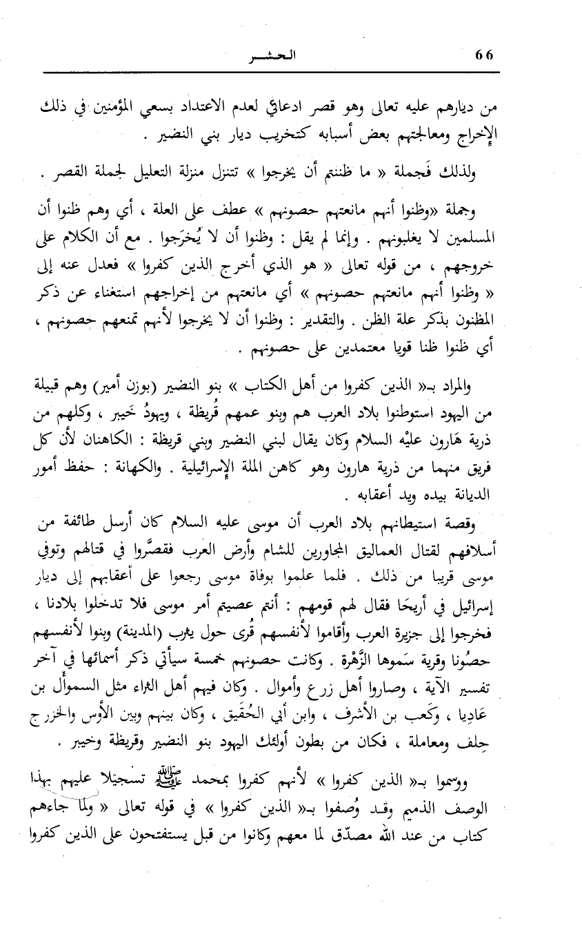 وَالْمُرَادُ بِ الَّذِينَ كَفَرُوا مِنْ أَهْلِ الْكِتابِ بَنُو النَّضِيرِ (بِوَزْنِ أَمِيرٍ) وَهُمْ قَبِيلَةٌ مِنَ الْيَهُودِ اسْتَوْطَنُوا بِلَادَ الْعَرَبِ هُمْ وَبَنُو عَمِّهِمْ قُرَيْظَةُ، وَيَهُودُ خَيْبَرَ، وَكُلُّهُمْ مِنْ ذُرِّيَّةِ هَارُونَ عَلَيْهِ السَّلَامُ وَكَانَ يُقَالُ لِبَنِي النَّضِيرِ وَبَنِي قُرَيْظَةَ: الْكَاهِنَانِ لِأَنَّ كُلَّ فَرِيقٍ مِنْهُمَا مِنْ ذُرِّيَّةِ هَارُونَ وَهُوَ كَاهِنُ الْمِلَّةِ الْإِسْرَائِيلِيَّةِ، وَالْكِهَانَةُ: حَفِظُ أُمُورِ الدِّيَانَةِ بِيَدِهِ وَيَدِ أَعْقَابِهِ.