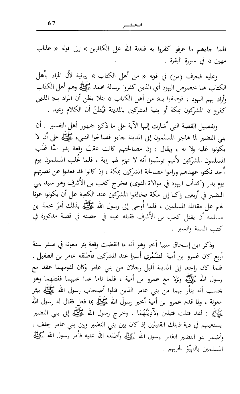 ، وَخَرَجَ رَسُول الله صَلَّى اللهُ عَلَيْهِ وَسَلَّمَ إِلَى بَنِي النَّضِيرِ يَسْتَعِينُهُمْ فِي دِيَةِ ذَيْنِكَ الْقَتِيلَيْنِ إِذْ كَانَ بَيْنَ بَنِي النَّضِيرِ وَبَيْنَ بَنِي عَامِرٍ حِلْفٌ، وَأَضْمَرَ بَنُو النَّضِيرِ الْغَدْرَ برَسُول الله صَلَّى اللهُ عَلَيْهِ وَسَلَّمَ وَأَطْلَعَهُ اللَّهُ عَلَيْهِ فَأَمَرَ رَسُول الله صَلَّى اللهُ عَلَيْهِ وَسَلَّمَ الْمُسْلِمِينَ بِالتَّهَيُّؤِ لِحَرْبِهِمْ.