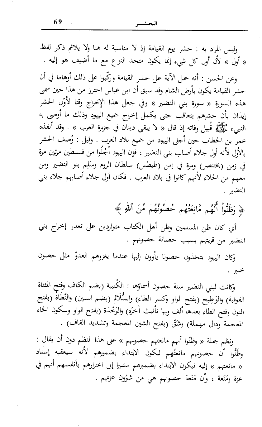 وَعَنِ الْحَسَنِ: أَنَّهُ حَمَلَ الْآيَةَ عَلَى حَشْرِ الْقِيَامَةِ وَرَكَّبُوا عَلَى ذَلِكَ أَوْهَامًا فِي أَنَّ حَشْرَ الْقِيَامَةِ يَكُونُ بِأَرْضِ الشَّامِ وَقَدْ سَبَقَ أَنَّ ابْنَ عَبَّاسٍ احْتَرَزَ مِنْ هَذَا حِينَ سَمَّى هَذِهِ السُّورَةَ «سُورَةُ بَنِي النَّضِيرِ» وَفِي جَعْلِ هَذَا الْإِخْرَاجِ وَقْتًا لِأَوَّلِ الْحَشْرِ إِيذَانٌ بِأَنَّ حَشْرَهُمْ يَتَعَاقَبُ حَتَّى يَكْمُلَ إِخْرَاجُ جَمِيعِ الْيَهُودِ وَذَلِكَ مَا أَوْصَى بِهِ النبيء صَلَّى اللهُ عَلَيْهِ وَسَلَّمَ قُبَيْلَ وَفَاتِهِ إِذْ