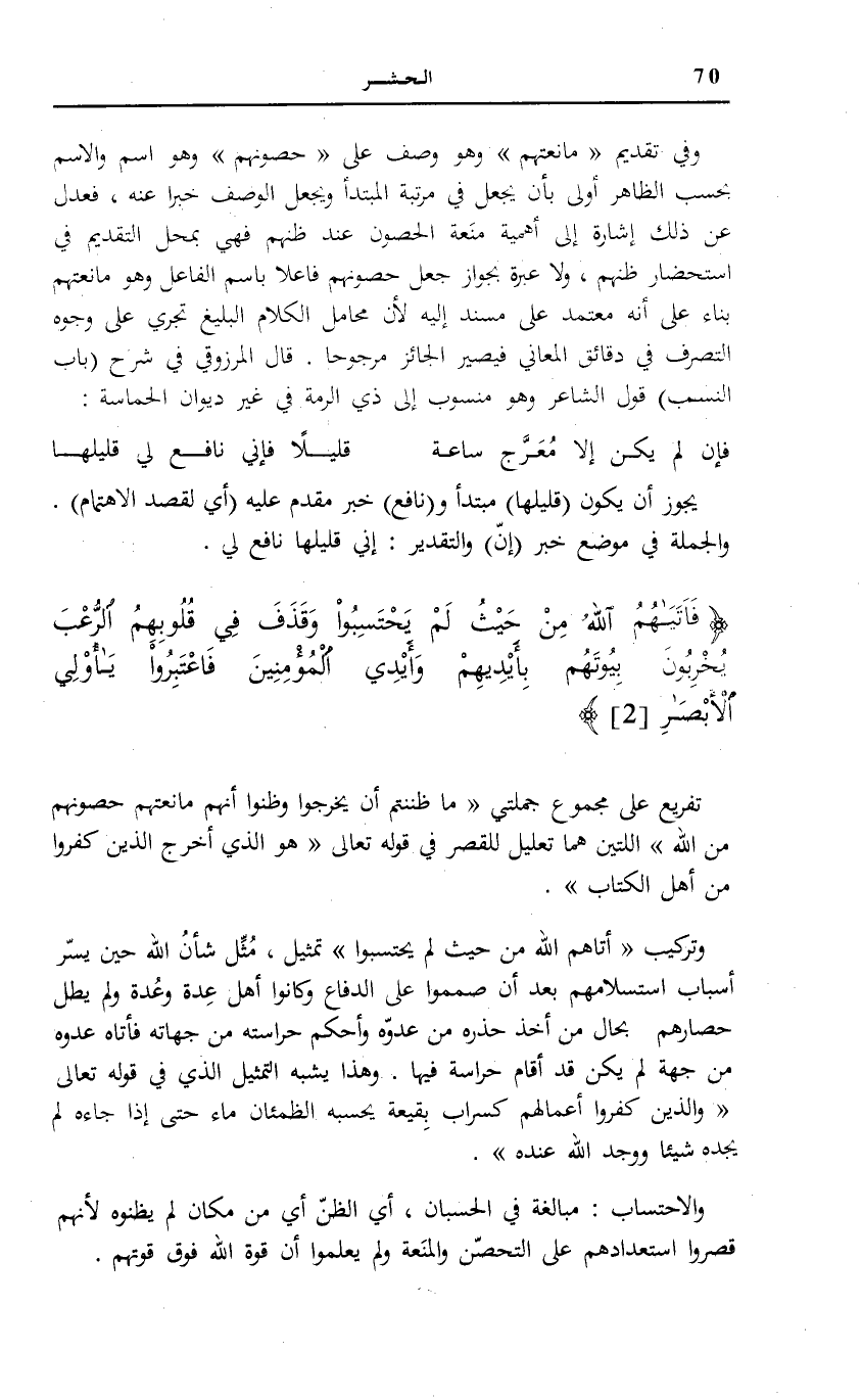وَفِي تَقْدِيمِ مانِعَتُهُمْ وَهُوَ وَصْفٌ عَلَى حُصُونُهُمْ وَهُوَ اسْمٌ وَالِاسْمُ بِحَسَبِ الظَّاهِرِ أَوْلَى بِأَن يَجْعَل فِي مرتبَة الْمُبْتَدَأِ وَيُجْعَلَ الْوَصْفُ خَبَرًا عَنْهُ، فَعَدَلَ عَنْ ذَلِكَ إِشَارَةً إِلَى أَهَمِّيَّةِ مَنَعَةِ الْحُصُونِ عِنْدَ ظَنِّهِمْ فَهِيَ بِمَحْلِّ التَّقْدِيمِ فِي اسْتِحْضَارِ ظَنِّهِمْ، وَلَا عِبْرَةَ بِجَوَازِ جَعْلِ حُصُونِهِمْ فَاعِلًا بِاسْمِ الْفَاعِلِ وَهُوَ مانِعَتُهُمْ بِنَاءٌ عَلَى أَنَّهُ مُعْتَمِدٌ عَلَى مُسْنَدٍ إِلَيْهِ لِأَنَّ مَحَامِلَ الْكَلَامِ الْبَلِيغِ تَجْرِي عَلَى وُجُوهِ التَّصَرُّفِ فِي دَقَائِقَ الْمَعَانِي فَيَصِيرُ الْجَائِزُ مَرْجُوحًا. قَالَ الْمَرْزُوقِيُّ فِي شَرْحِ (بَابِ النَّسَبِ) قَوْلُ الشَّاعِرِ وَهُوَ مَنْسُوبٌ إِلَى ذِي الرُّمَّةِ فِي غَيْرِ دِيوَانِ الْحَمَاسَةِ: